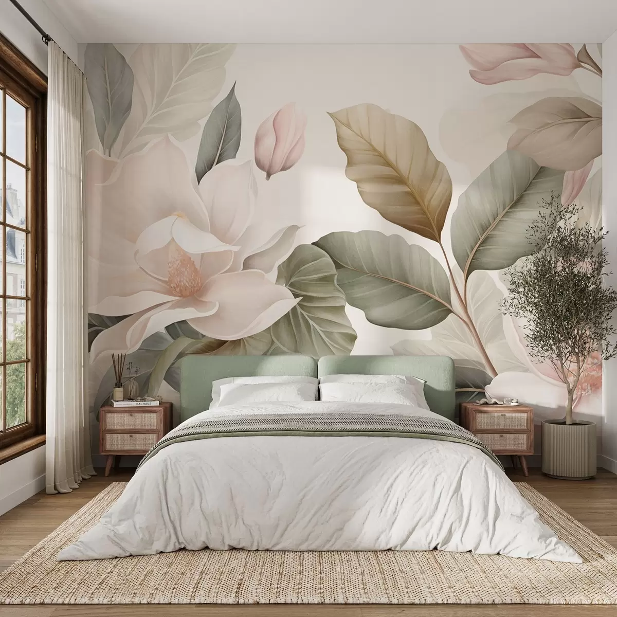 Stenske poslikave Magnolijevi cvetovi z listi v pastelnih barvah, beli, rožnati in zeleni, mehki, nežni, v akvarelnem slogu Št. w09427
