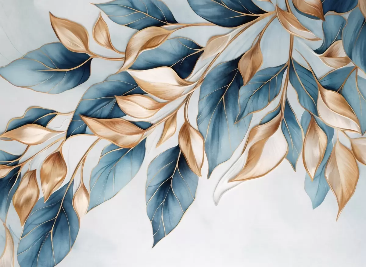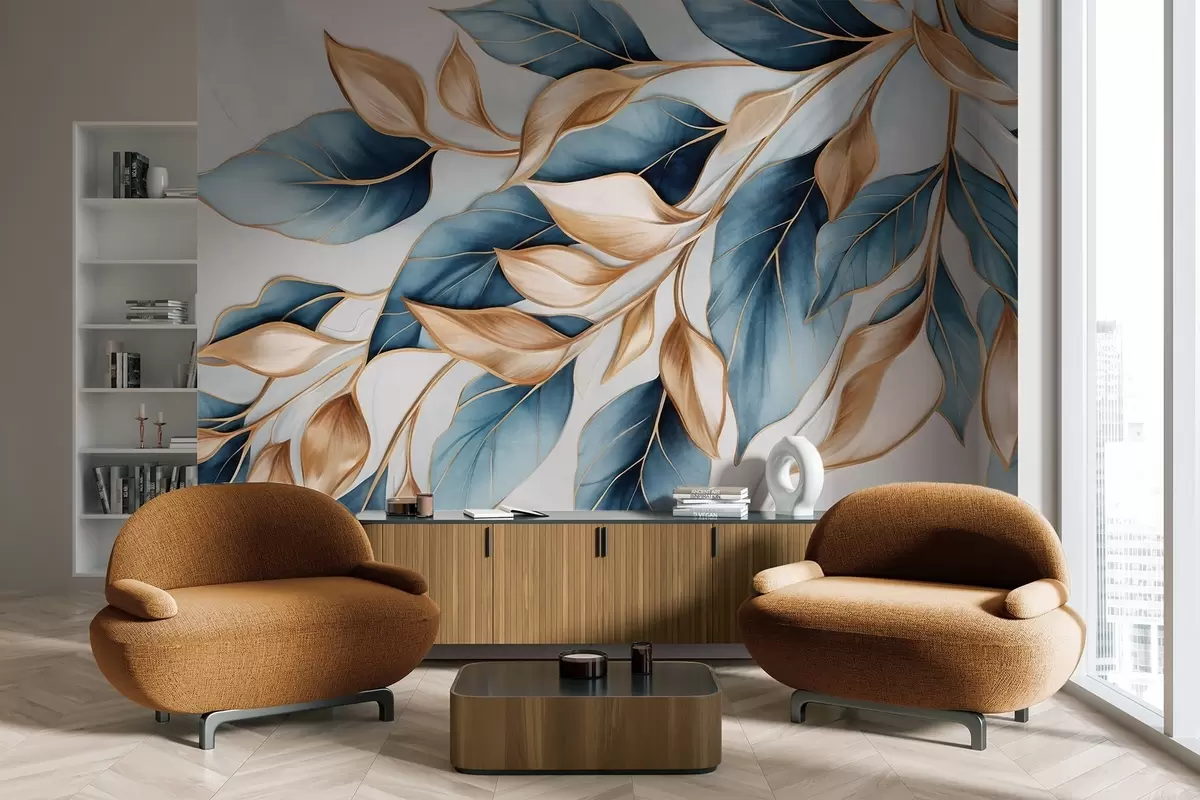 Stenske poslikave Teksturirani modri in oranžni listi, svetlo modro ozadje, eleganten in umetniški dizajn, sodoben stil Št. w09429