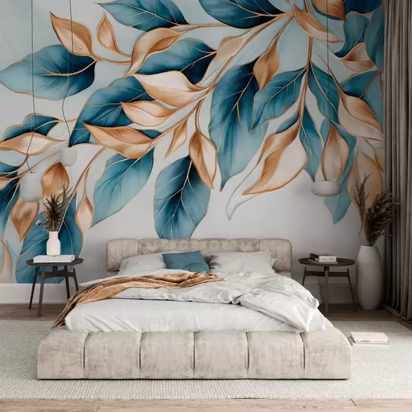 Stenske poslikave Teksturirani modri in oranžni listi, svetlo modro ozadje, eleganten in umetniški dizajn, sodoben stil Št. w09429