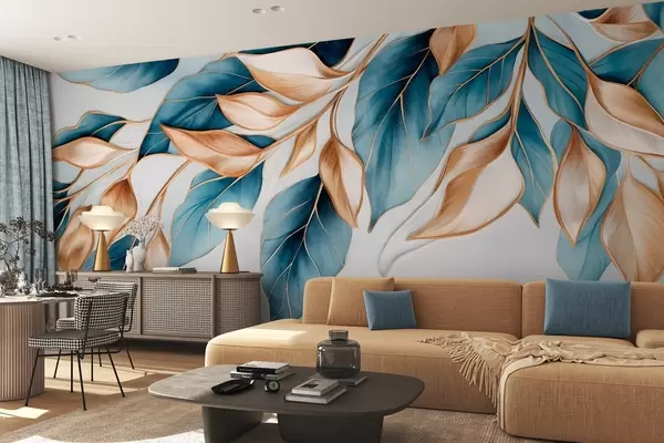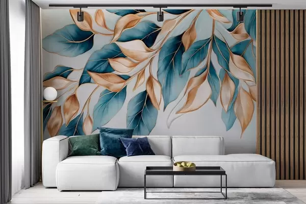 Stenske poslikave Teksturirani modri in oranžni listi, svetlo modro ozadje, eleganten in umetniški dizajn, sodoben stil Št. w09429