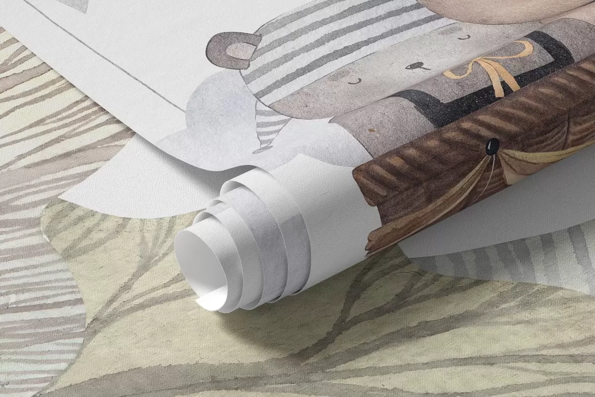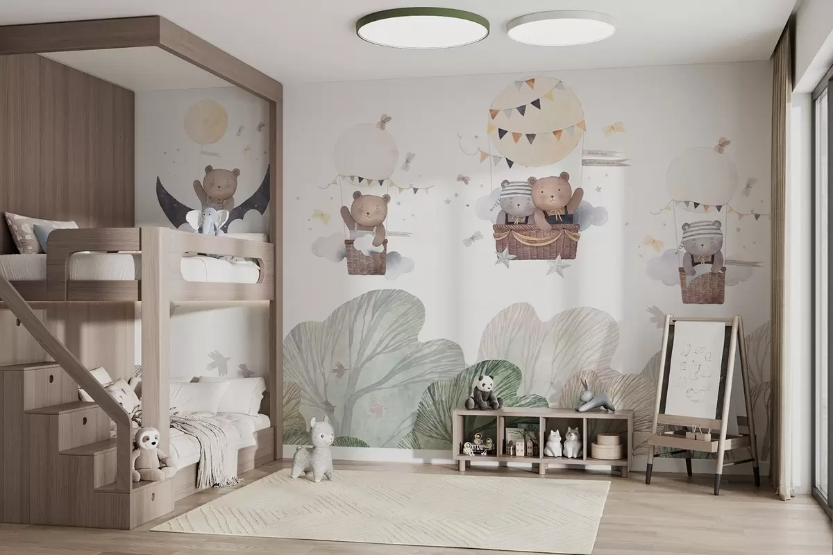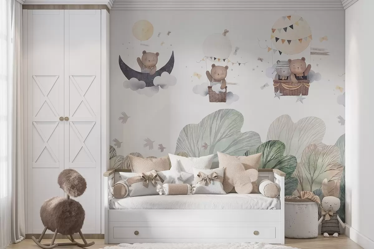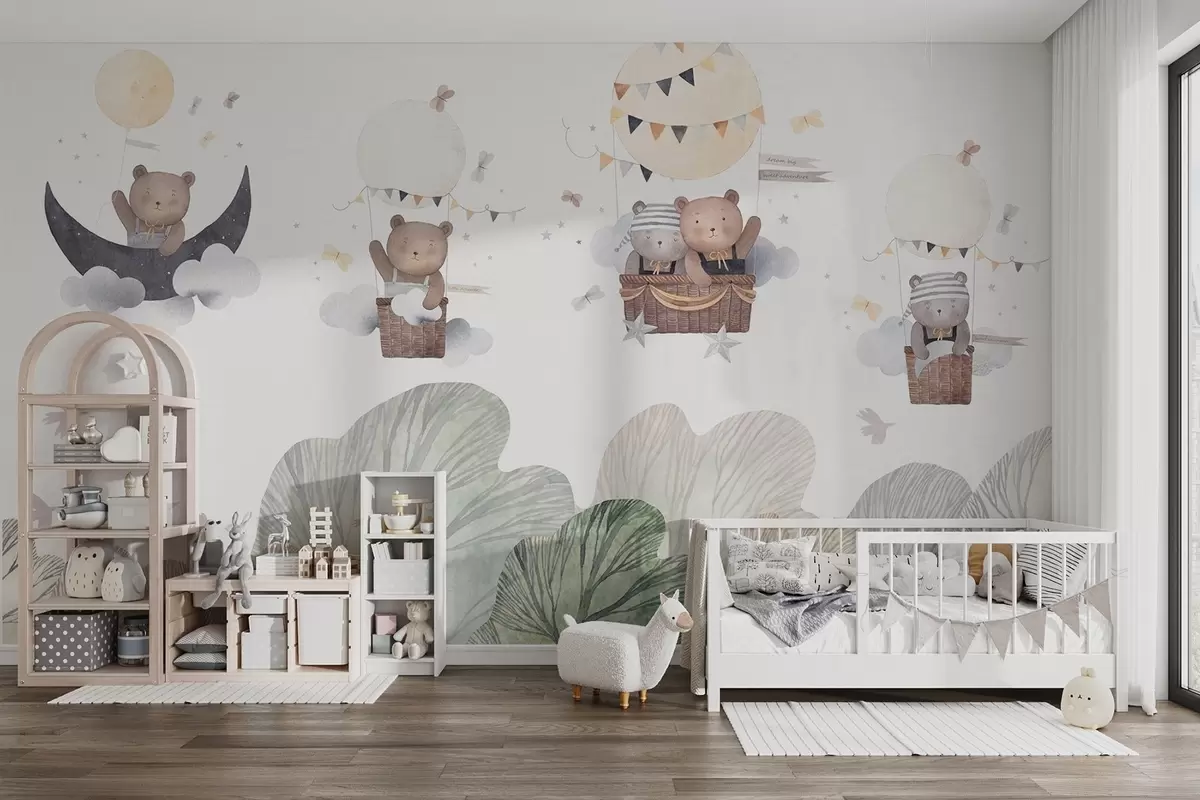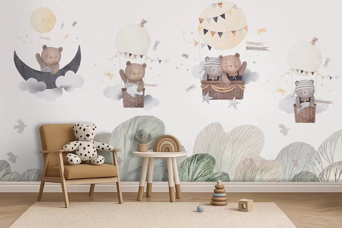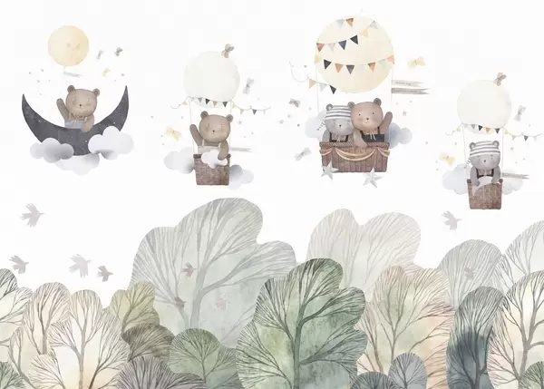 Stenske poslikave Baloni v akvarelnem slogu z medvedi nad gozdom Št. w09437