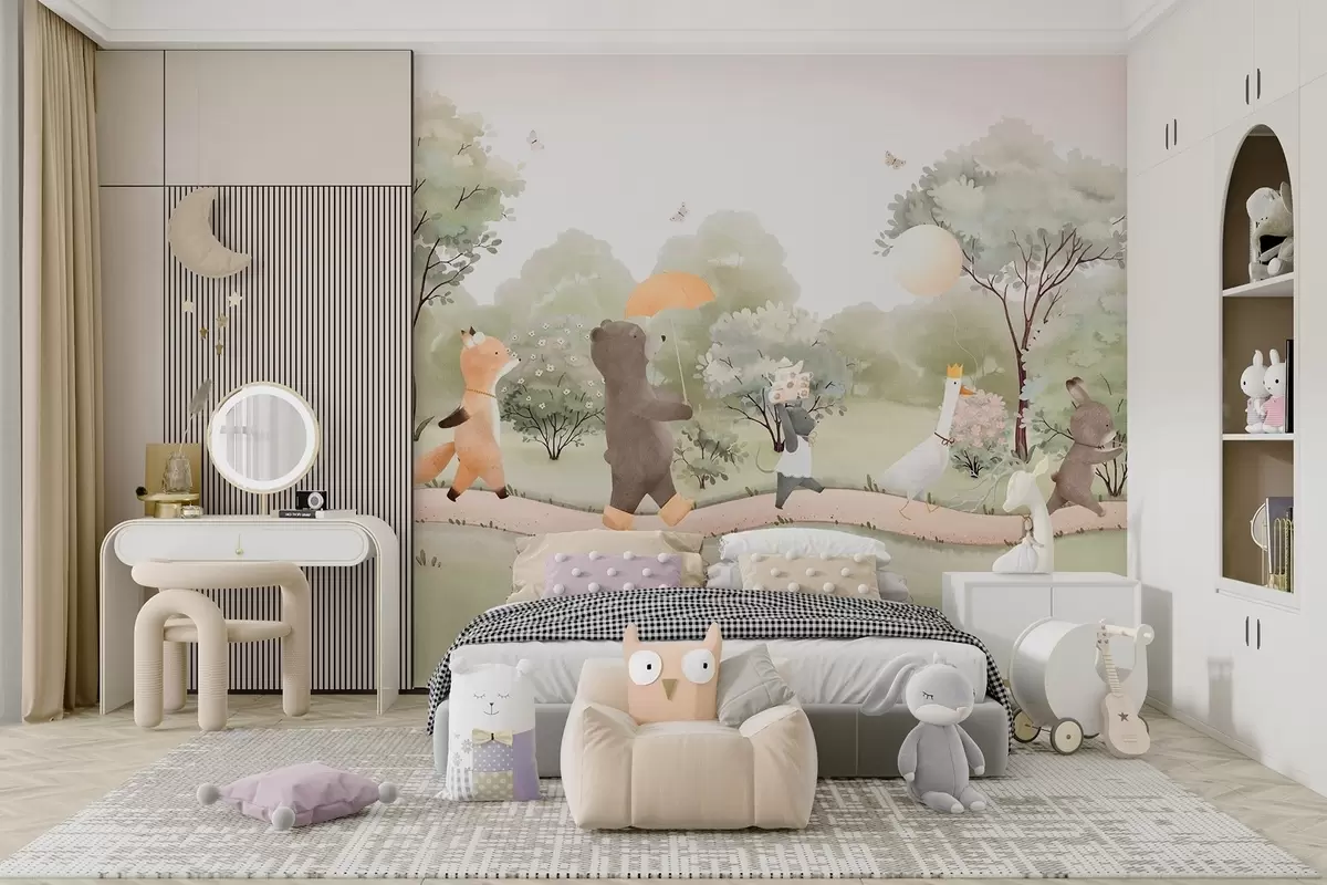 Stenske poslikave Praznično potovanje majhnih živali skozi gozd v akvarelnem slogu Št. w09440