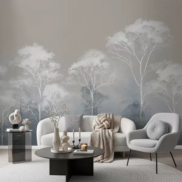 Stenske poslikave Minimalistična drevesa v modro-sivi barvni paleti, v megli Št. w09448