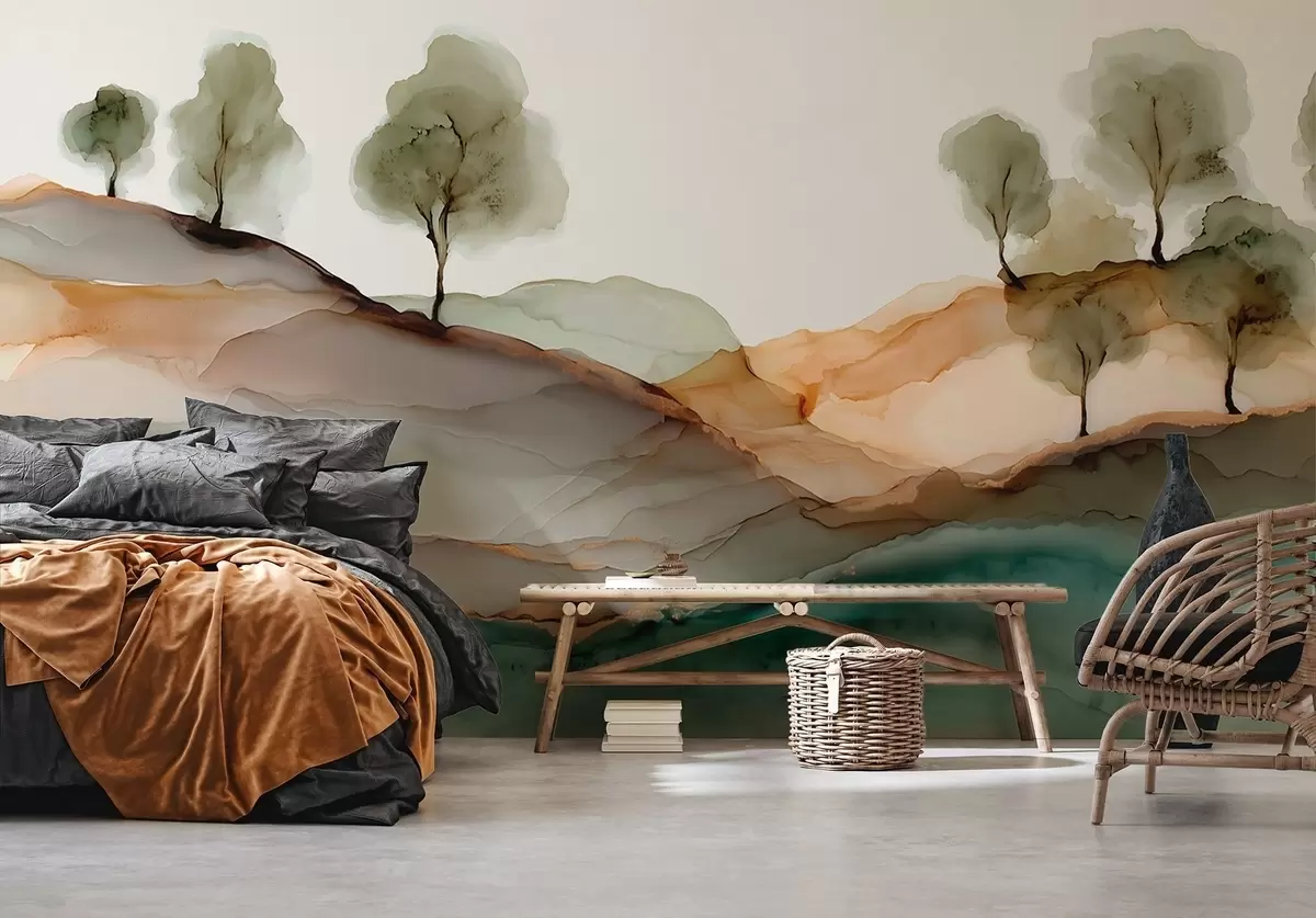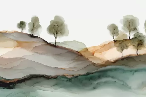 Stenske poslikave Abstraktna pokrajina v slogu alkoholnih črnil — hribi in drevesa v pastelnih tonih Št. w09457
