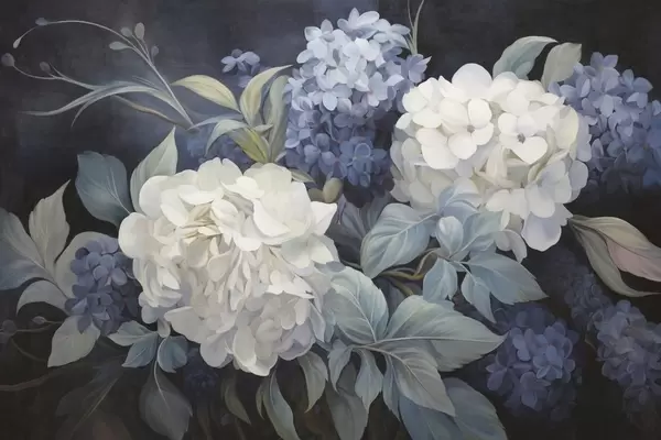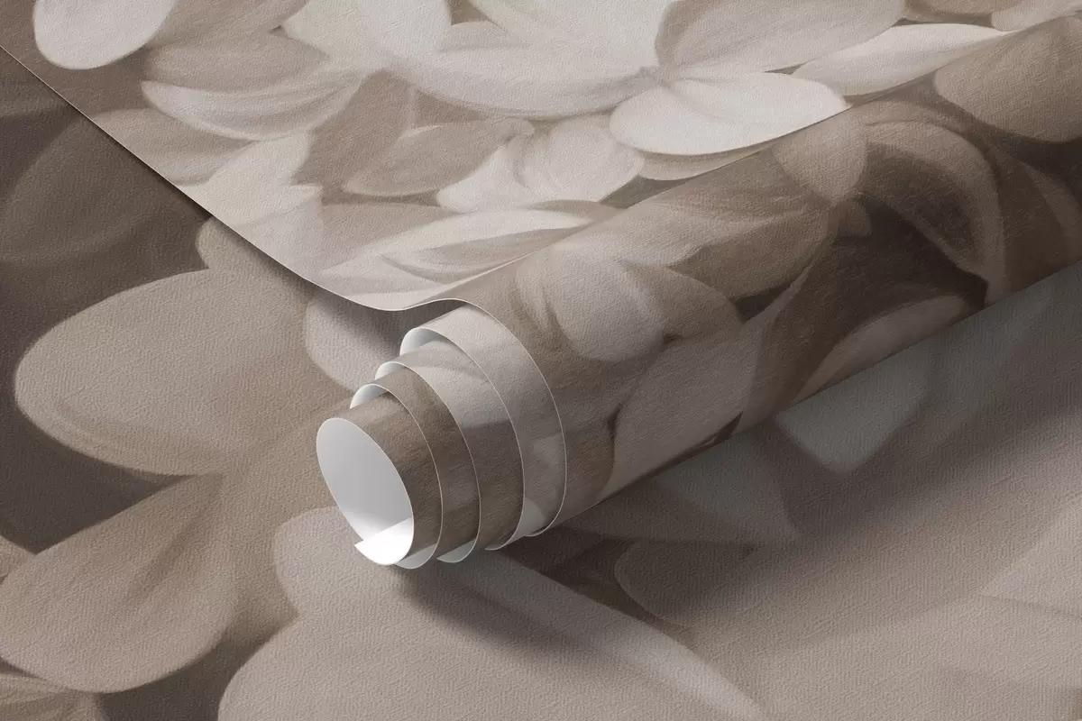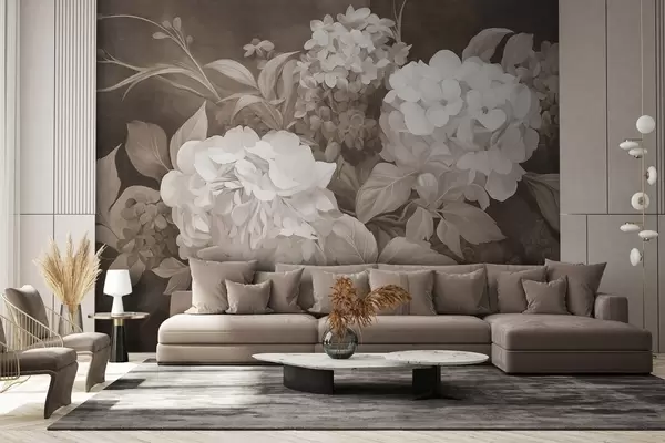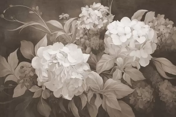 Stenske poslikave Teksturirana imitacija slike v sepiastih barvah cvetov hortenzij z velikimi listi, abstraktnim in temnim ozadjem Št. w09465