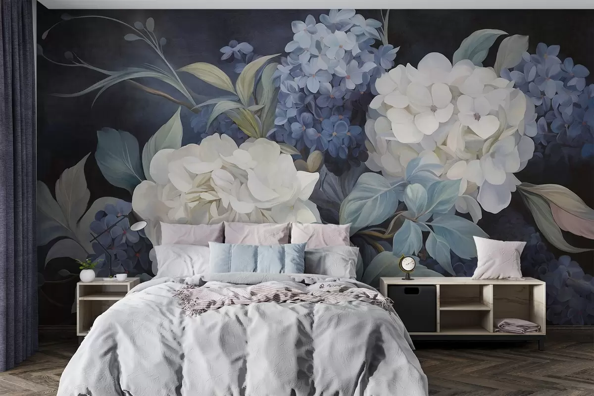 Stenske poslikave Teksturirana temno modra slika, ki posnema cvetove hortenzij z velikimi listi, abstraktno in temno ozadje Št. w09465v1