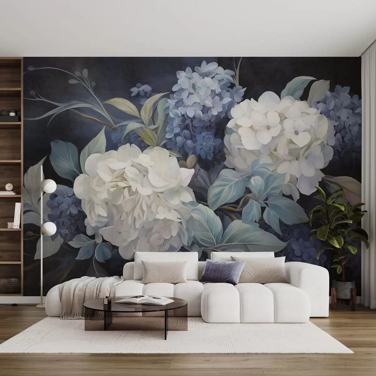 Stenske poslikave Teksturirana temno modra slika, ki posnema cvetove hortenzij z velikimi listi, abstraktno in temno ozadje Št. w09465v1