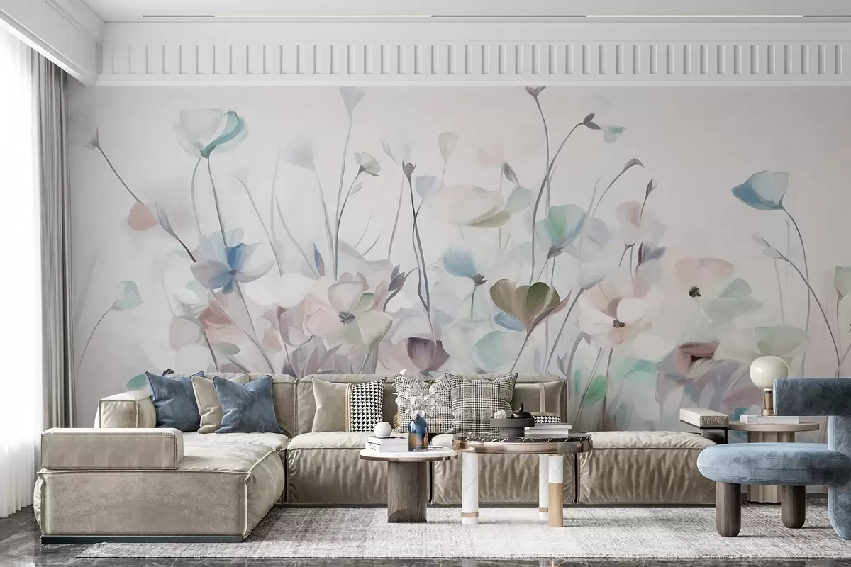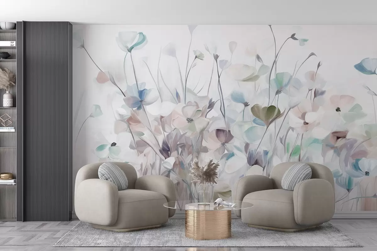 Stenske poslikave Abstraktno polje modrih in rjavih cvetov z dolgimi stebli in listi, teksturirano, pastelne, pridušene barve Št. w09466v1