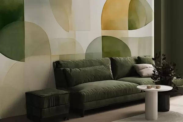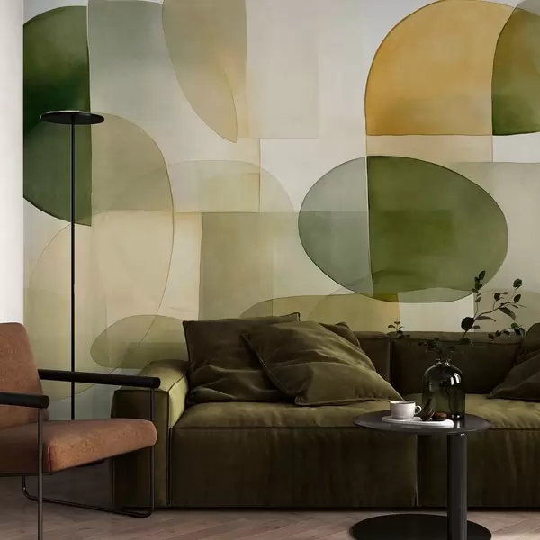 Stenske poslikave Abstraktne teksturirane oblike v odtenkih zelene in rumene barve, pridušeni toni, minimalistična kompozicija, nevtralno ozadje Št. w09467