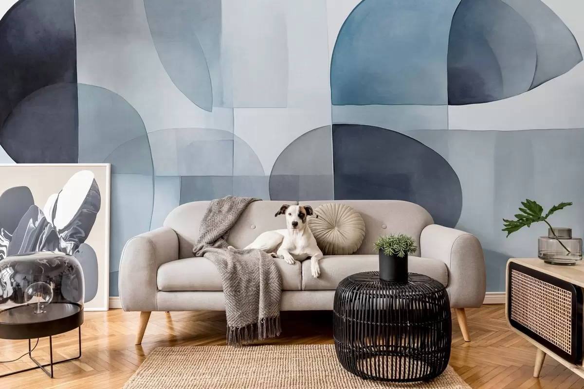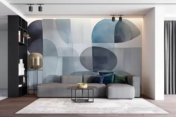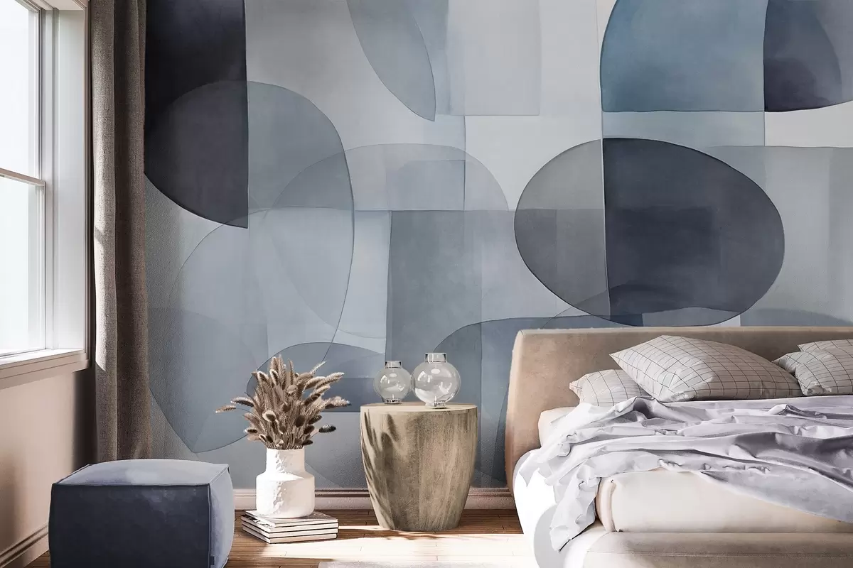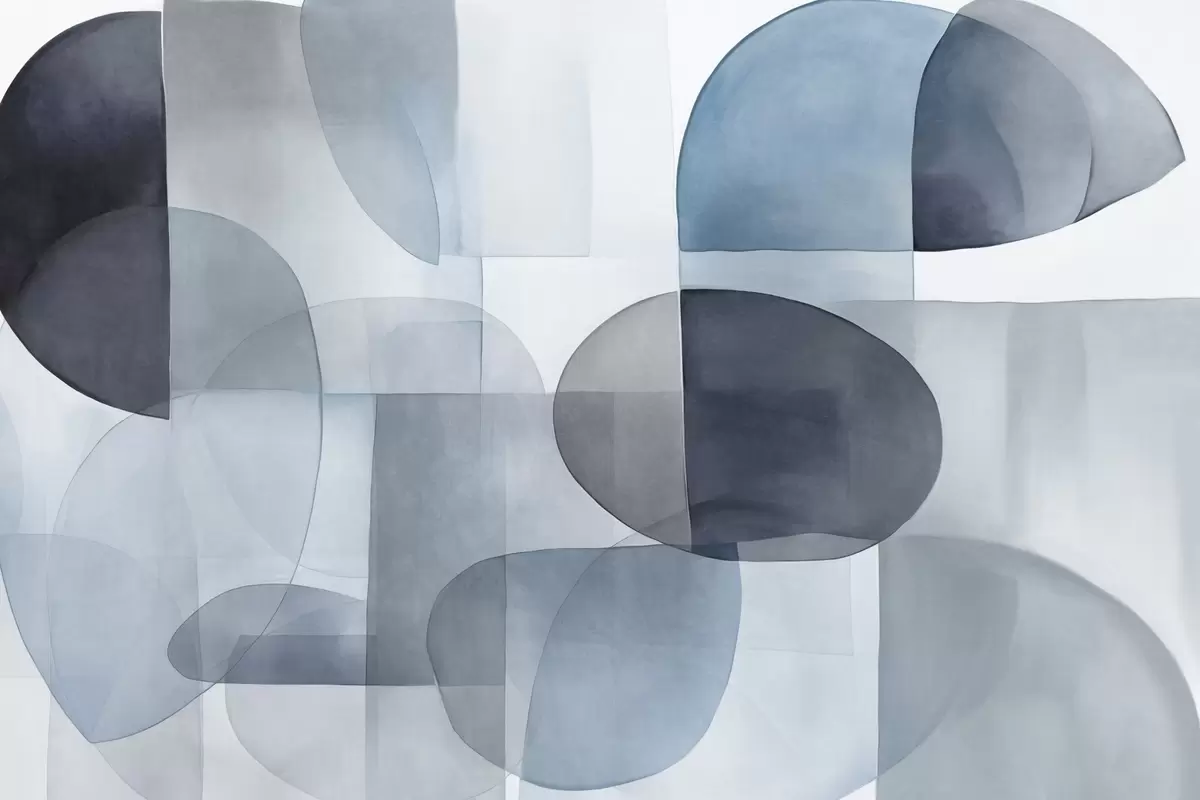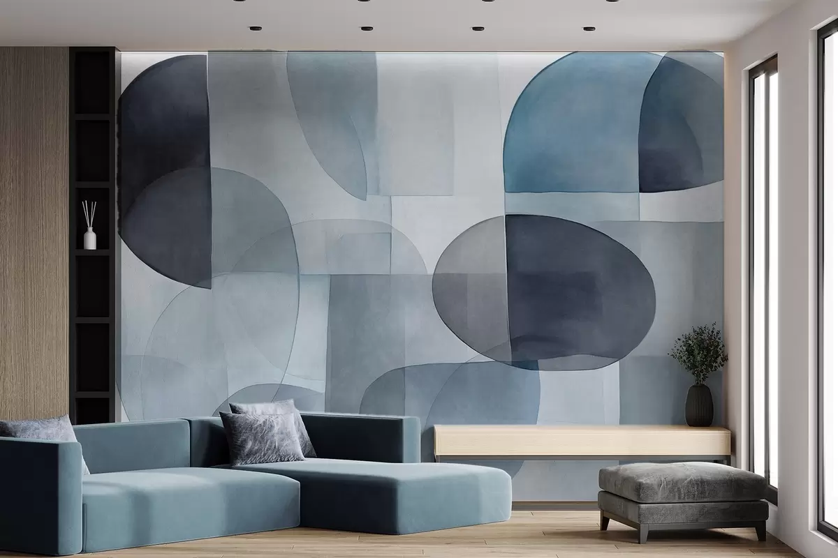 Stenske poslikave Abstraktne teksturirane oblike v sivih in modrih odtenkih, pridušeni toni, minimalistična kompozicija, nevtralno ozadje Št. w09467v1