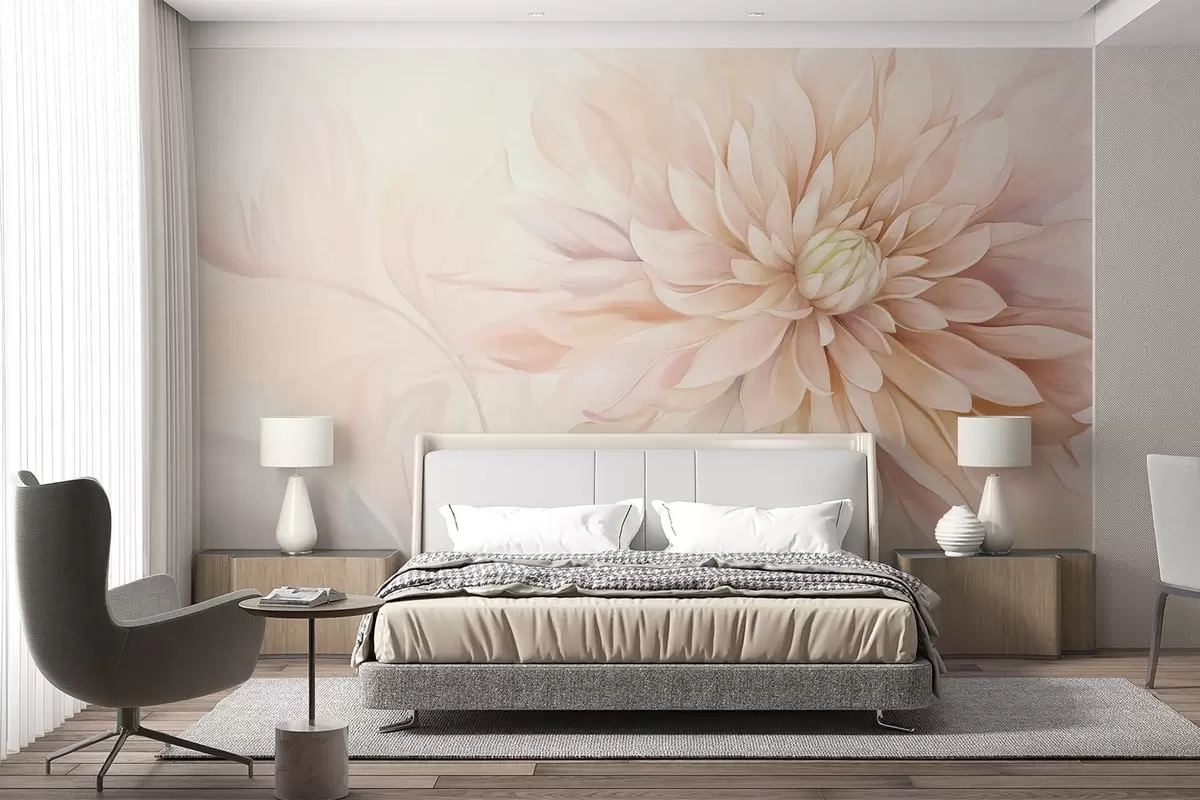 Stenske poslikave Svetlo rožnata dalija z mnogimi cvetnimi listi, mehka tekstura pastelne barve z odtenki zelene in bež barve Št. w09470