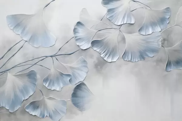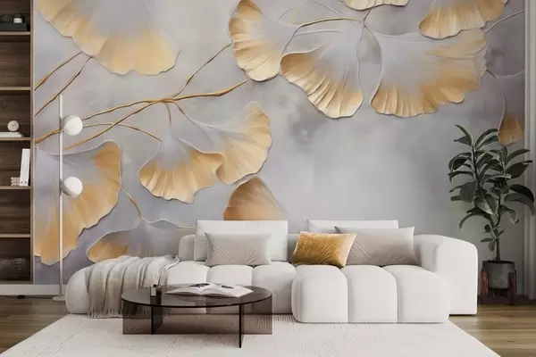 Stenske poslikave Listi ginkga biloba z rumenimi robovi na veji, sivo teksturirano ozadje, eleganten in minimalističen dizajn Št. w09472