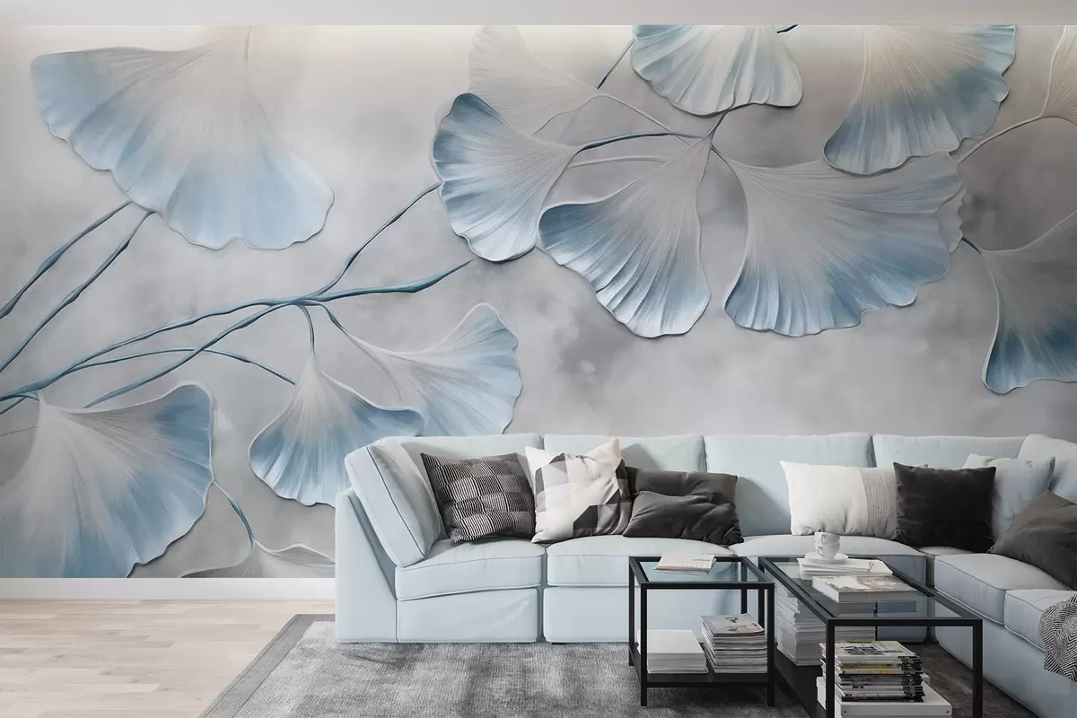 Stenske poslikave Listi ginkga bilobe z modrimi robovi na veji, sivo teksturirano ozadje, eleganten in minimalističen dizajn Št. w09472v1
