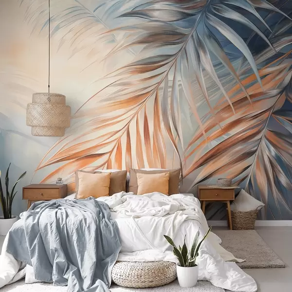 Stenske poslikave Palmovi listi v oranžnih in modrih odtenkih, svetlo teksturirano ozadje z nežnimi barvami, eleganten tropski stil Št. w09475