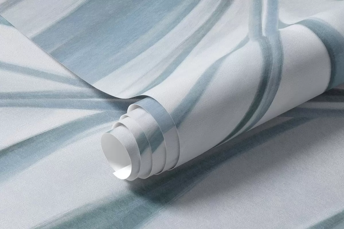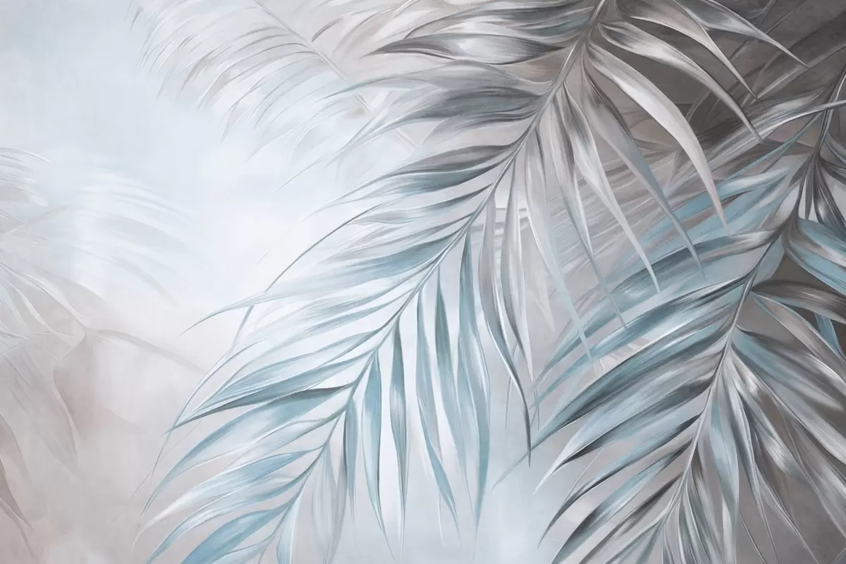 Stenske poslikave Palmovi listi v sivih in modrih odtenkih, svetlo teksturirano ozadje z nežnimi barvami, eleganten tropski stil Št. w09475v1
