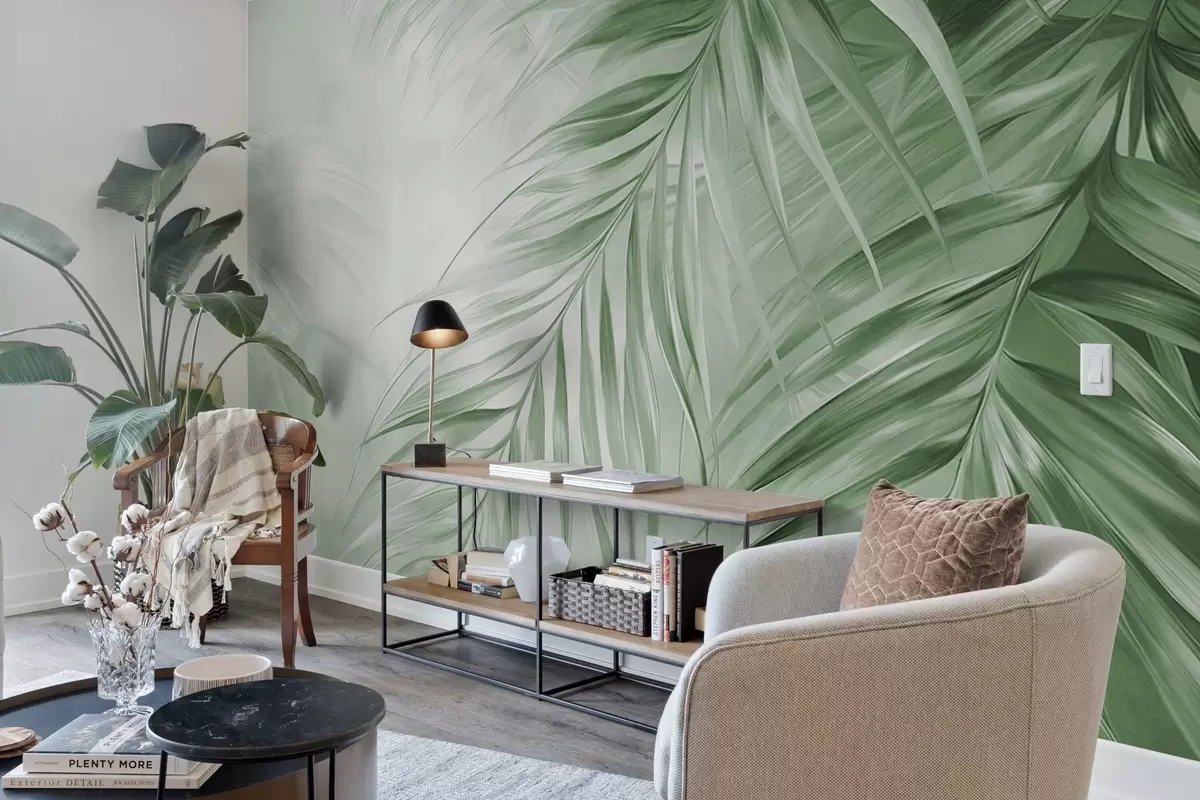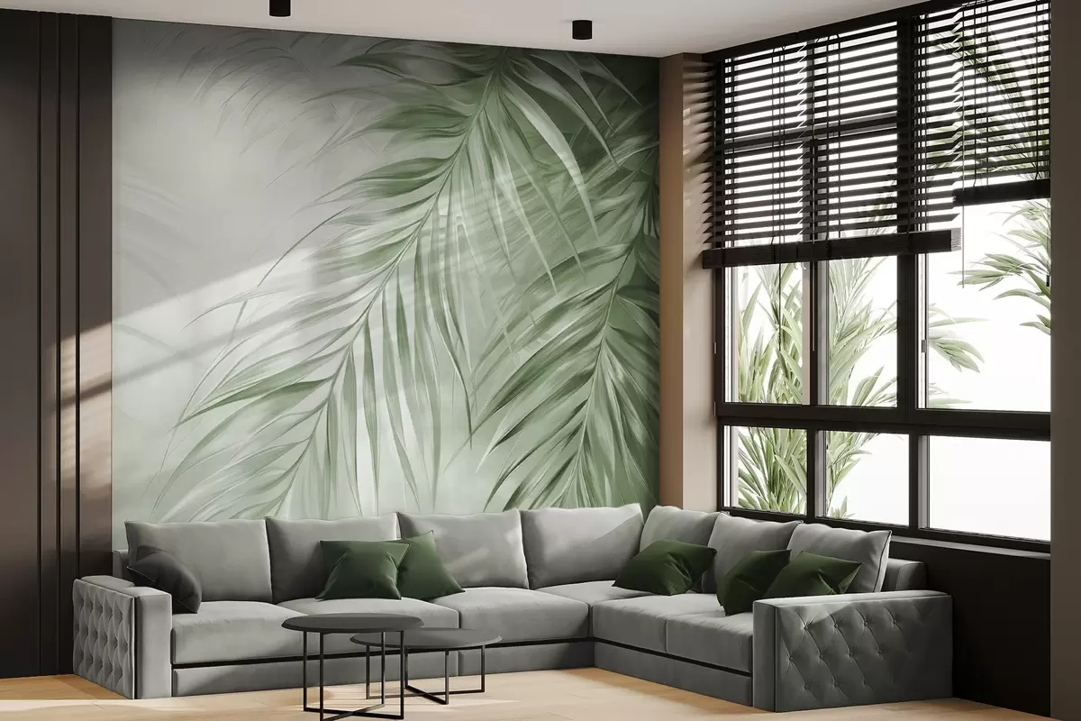 Stenske poslikave Palmovi listi z zelenimi odtenki, svetlo teksturirano ozadje z nežnimi barvami, eleganten tropski stil Št. w09475v2