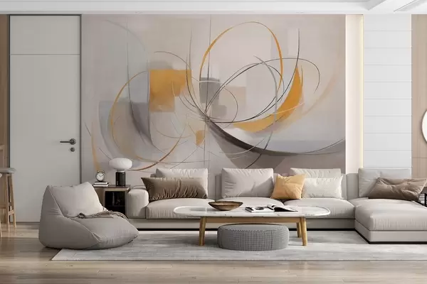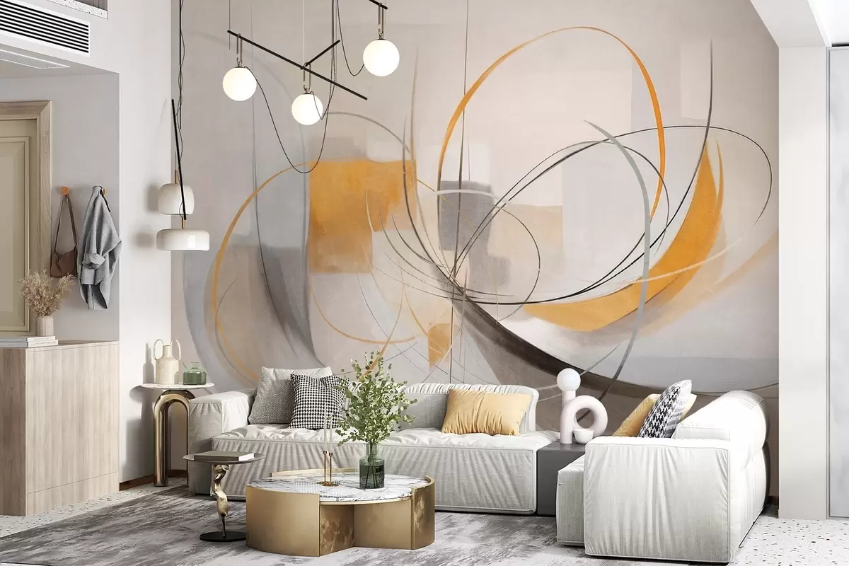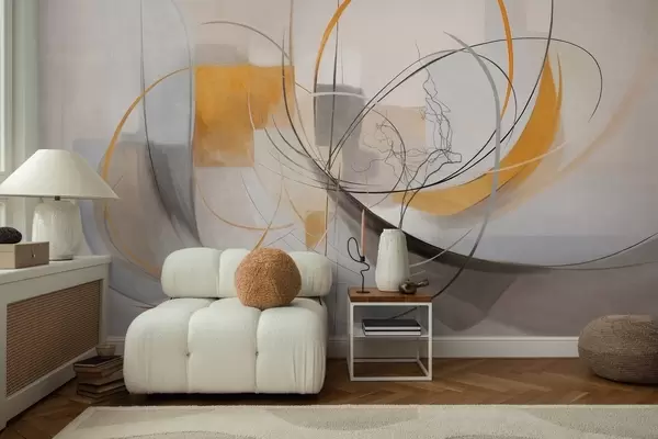 Stenske poslikave Abstraktni teksturirani sodobni slikarski slog z ukrivljenimi črtami in geometrijskimi oblikami v odtenkih sive, bele in oranžne barve Št. w09476