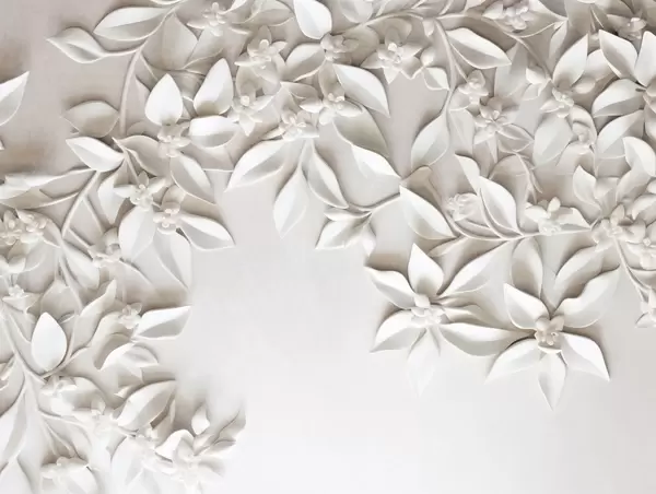Stenske poslikave Bele cvetlice in listi s teksturo, cvetlični aranžma, eleganten dizajn, minimalistični slog, dekorativna umetnost Št. w09479