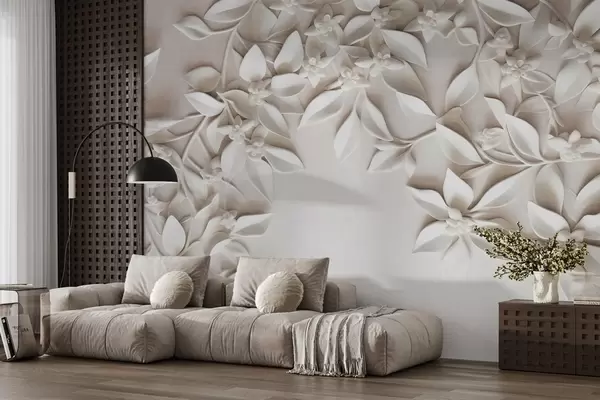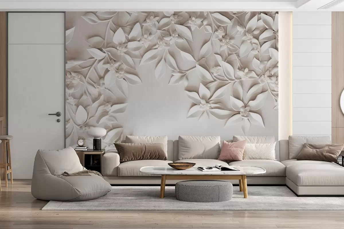 Stenske poslikave Bele cvetlice in listi s teksturo, cvetlični aranžma, eleganten dizajn, minimalistični slog, dekorativna umetnost Št. w09479
