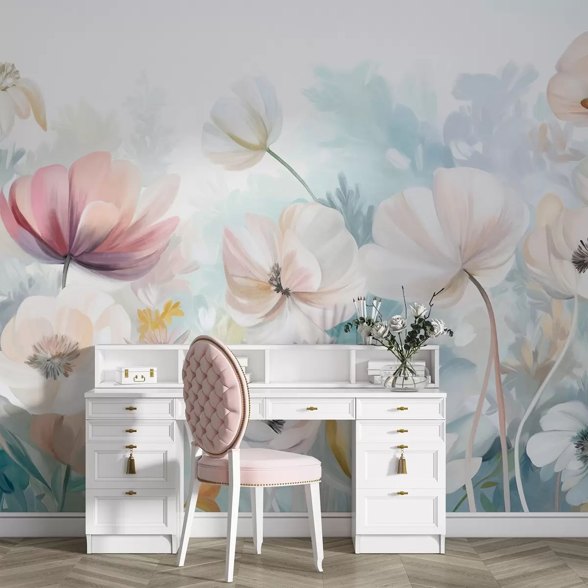 Stenske poslikave Polje cvetov v pastelnih barvah z nežnimi cvetnimi listi in mehkimi zelenimi listi, v sanjskem, teksturiranem akvarelnem slogu Št. w09481