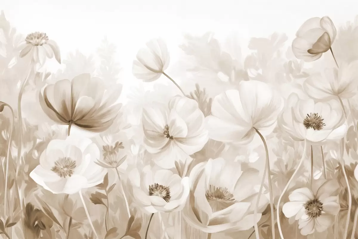 Stenske poslikave Polje bež cvetov z nežnimi cvetnimi listi, mehkimi rjavimi listi, v sanjskem, teksturiranem akvarelnem slogu Št. w09481v1