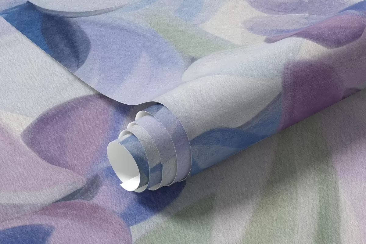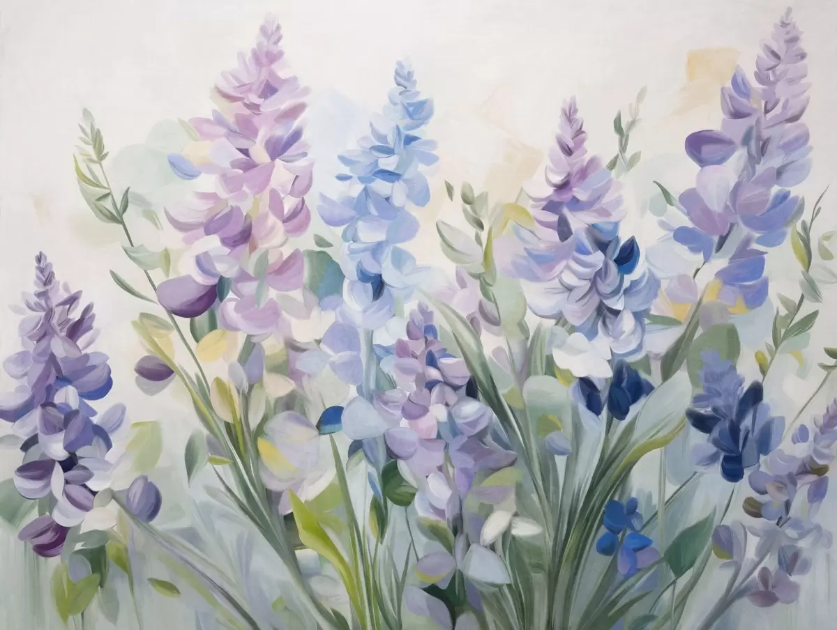 Stenske poslikave Vijolične in modre cvetlice z modrimi listi, svetlo ozadje, mehki čopični potegi, živahne barve Št. w09482