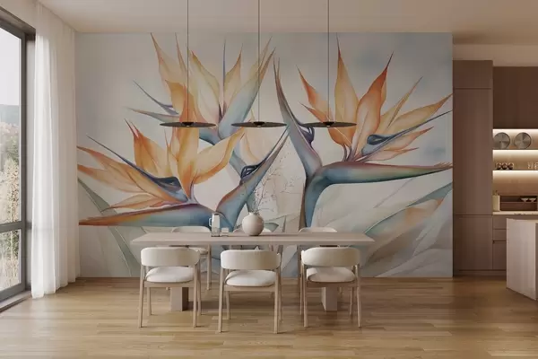 Stenske poslikave Rajska ptica, strelitzia z oranžnimi cvetnimi listi, mehka akvarelna tekstura, svetlo ozadje Št. w09483