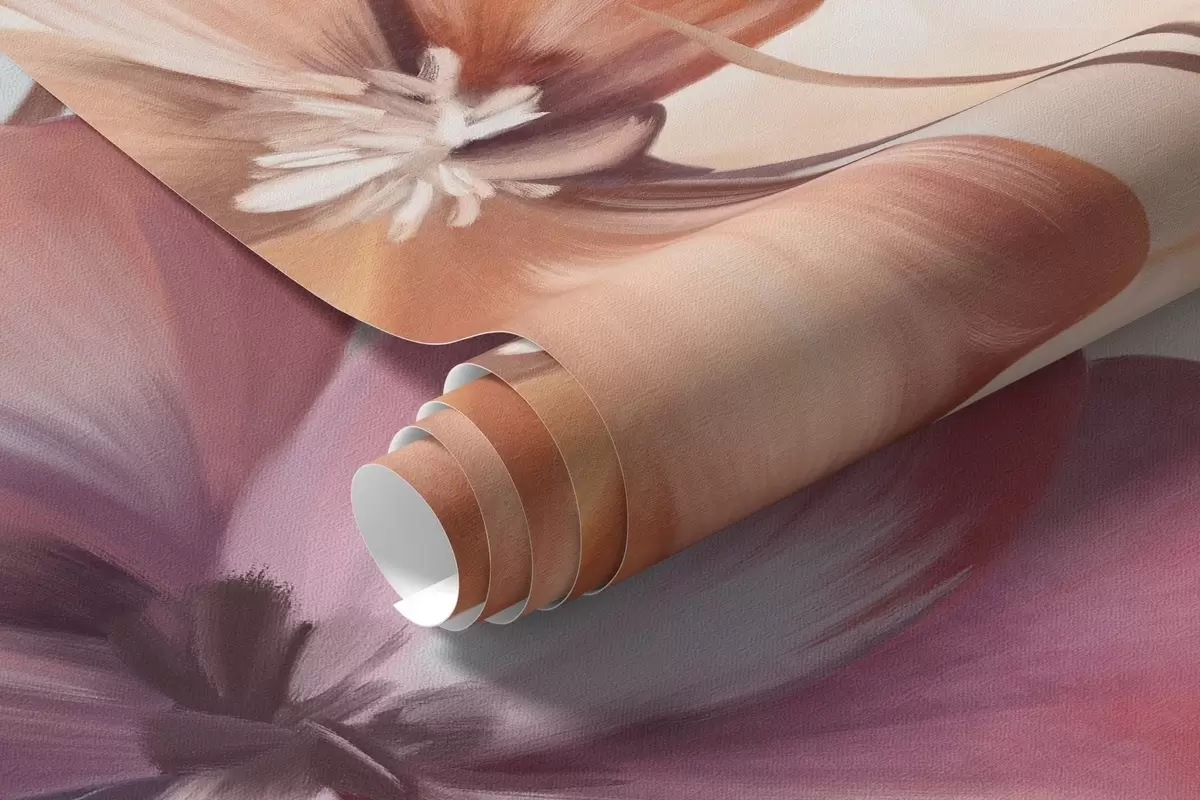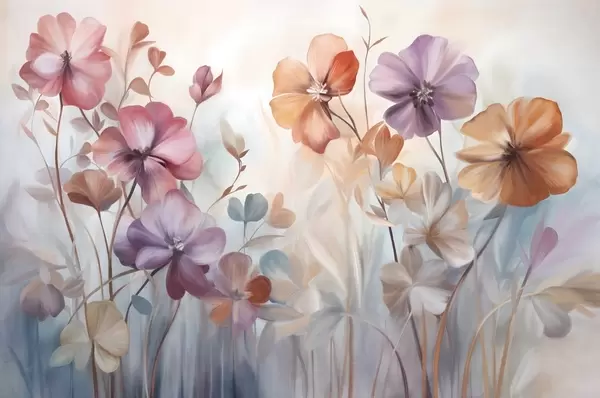 Stenske poslikave Teksturni cvetlični aranžma z rožnatimi, vijoličnimi in oranžnimi cvetovi z zelenimi stebli in listi, v nežnih pastelnih barvah Št. w09486