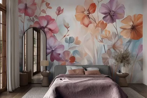 Stenske poslikave Teksturni cvetlični aranžma z rožnatimi, vijoličnimi in oranžnimi cvetovi z zelenimi stebli in listi, v nežnih pastelnih barvah Št. w09486