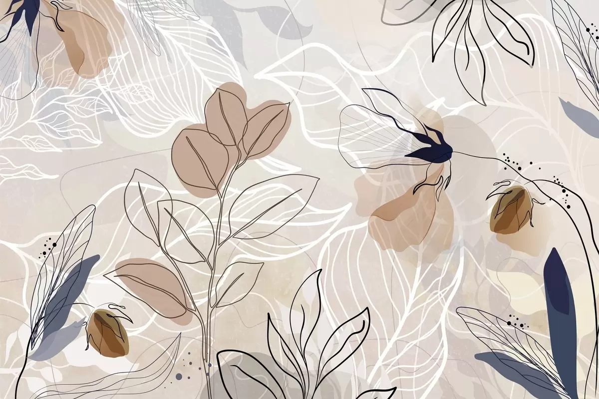 Stenske poslikave Bež abstraktno ozadje z listi in cvetovi v črno-beli risbi, moderno, minimalistično, organske oblike, botanični potisk Št. w09487