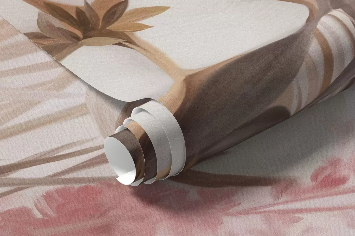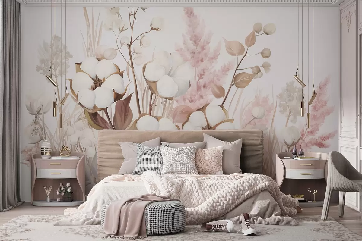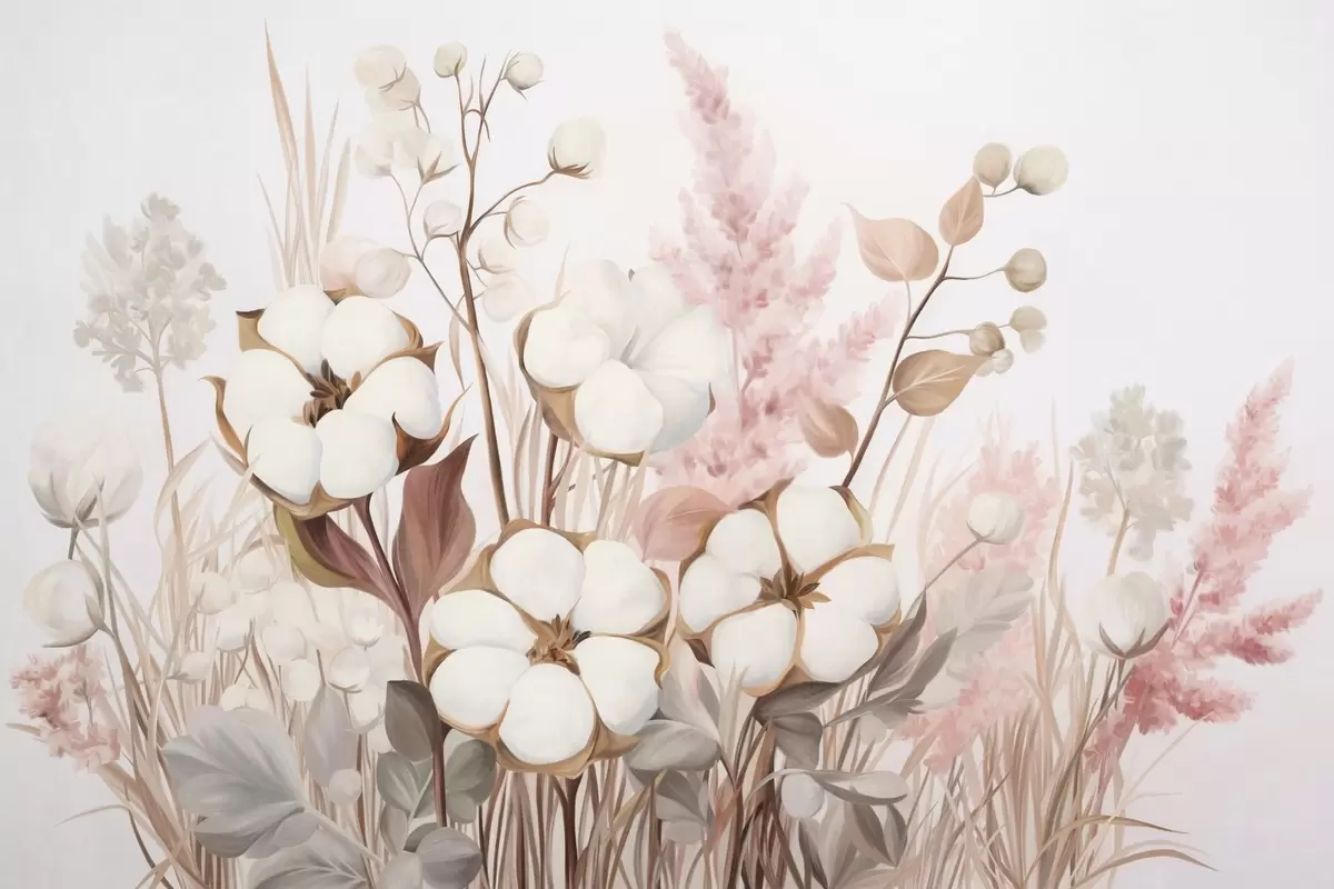 Stenske poslikave Cvetovi iz bombaža z belo in rožnato travo pampas, bež in rjavimi listi in zelišči, belo ozadje Št. w09489