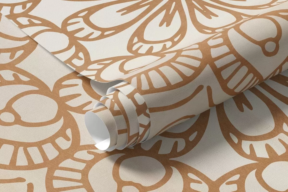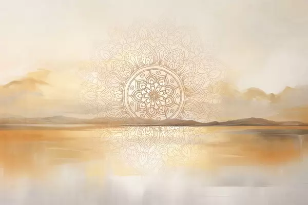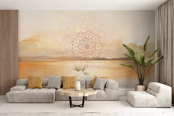 Stenske poslikave Teksturiran simetričen mandala vzorec, ki prekriva pokrajino z morjem, hribi in nebom, v nežnih pastelnih barvah Št. w09491