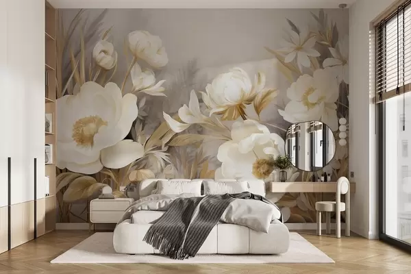 Stenske poslikave Bele in rumene potonike ter druge cvetlice z visoko travo in listi v mehkem, slikarskem teksturiranem slogu Št. w09494