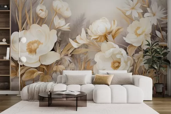 Stenske poslikave Bele in rumene potonike ter druge cvetlice z visoko travo in listi v mehkem, slikarskem teksturiranem slogu Št. w09494