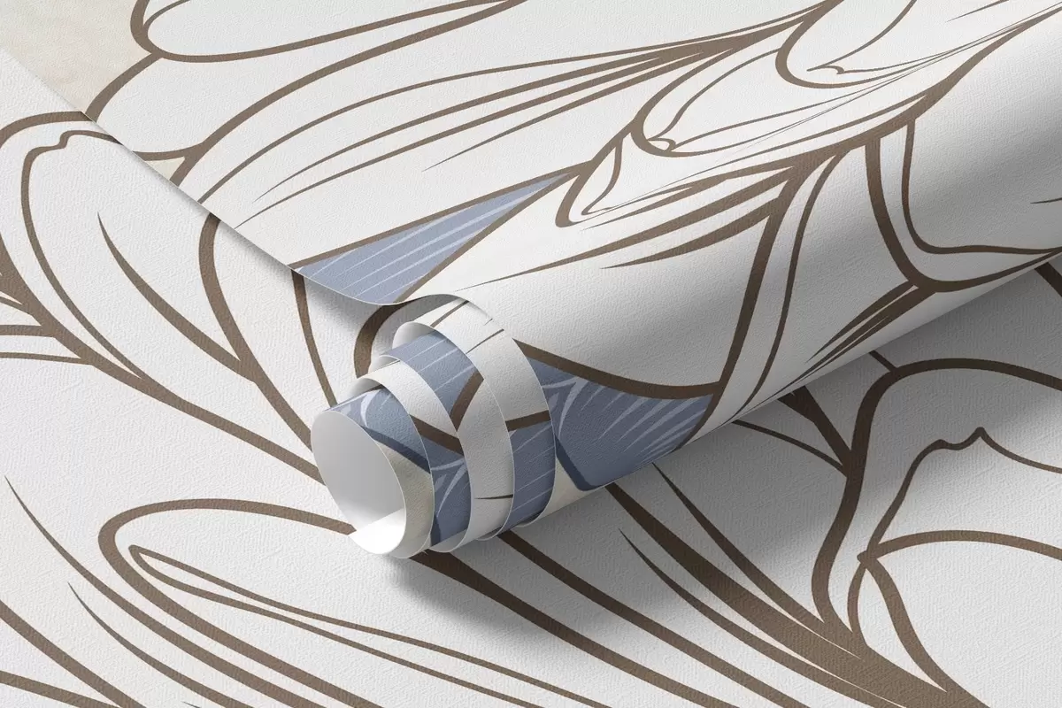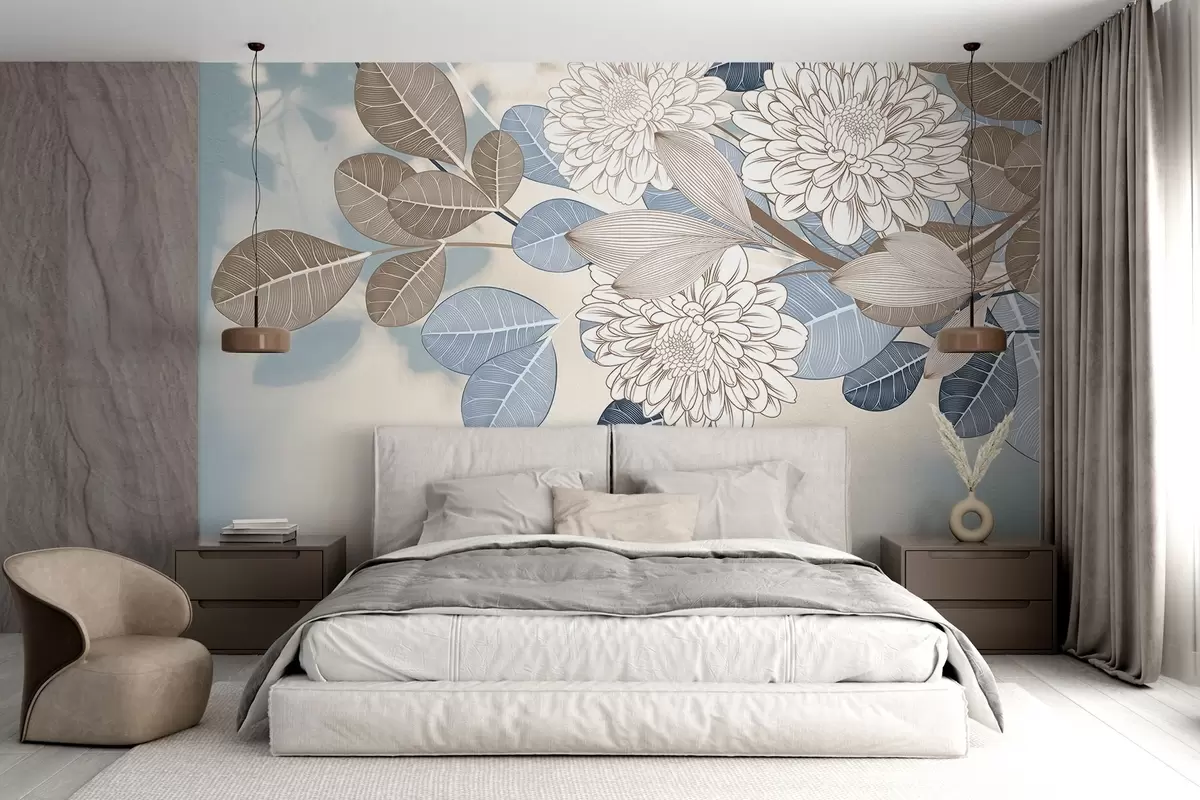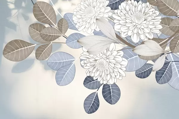 Stenske poslikave Bele cvetlice z modrimi in rjavimi listi, svetlo modro teksturirano ozadje, cvetlični aranžma, podrobna risba Št. w09496
