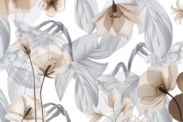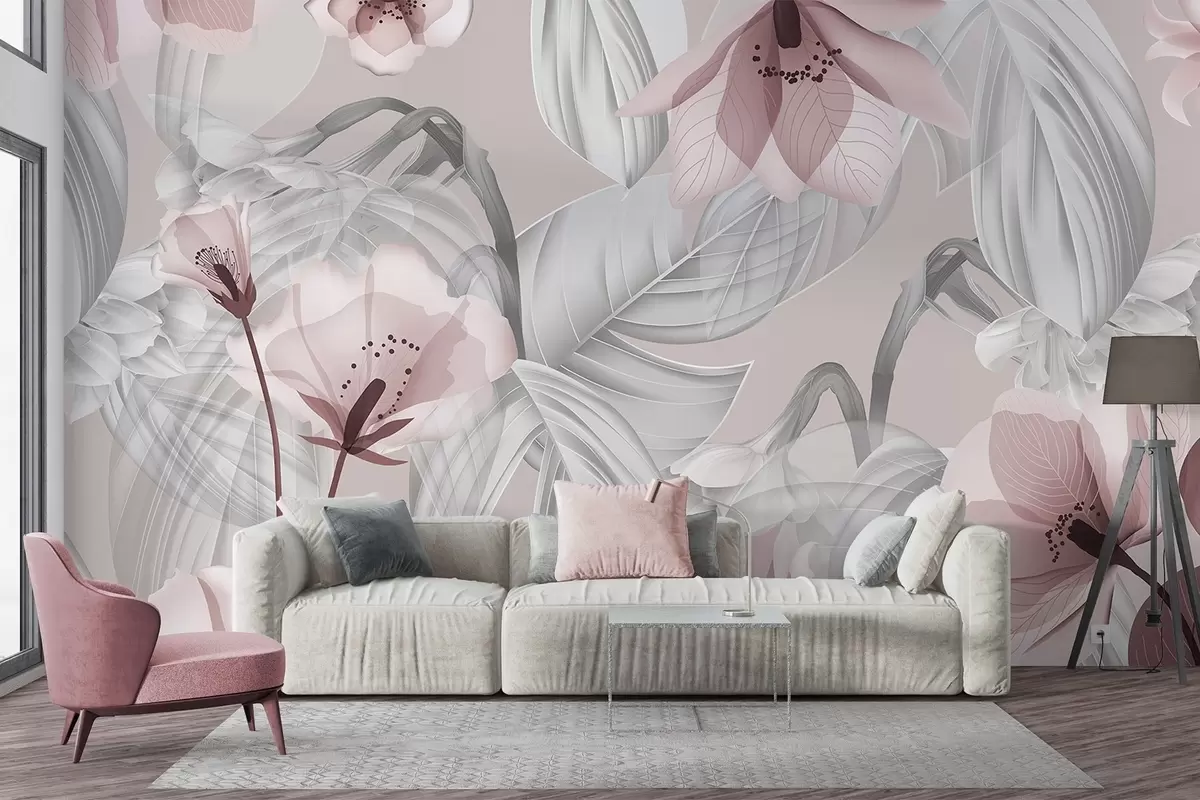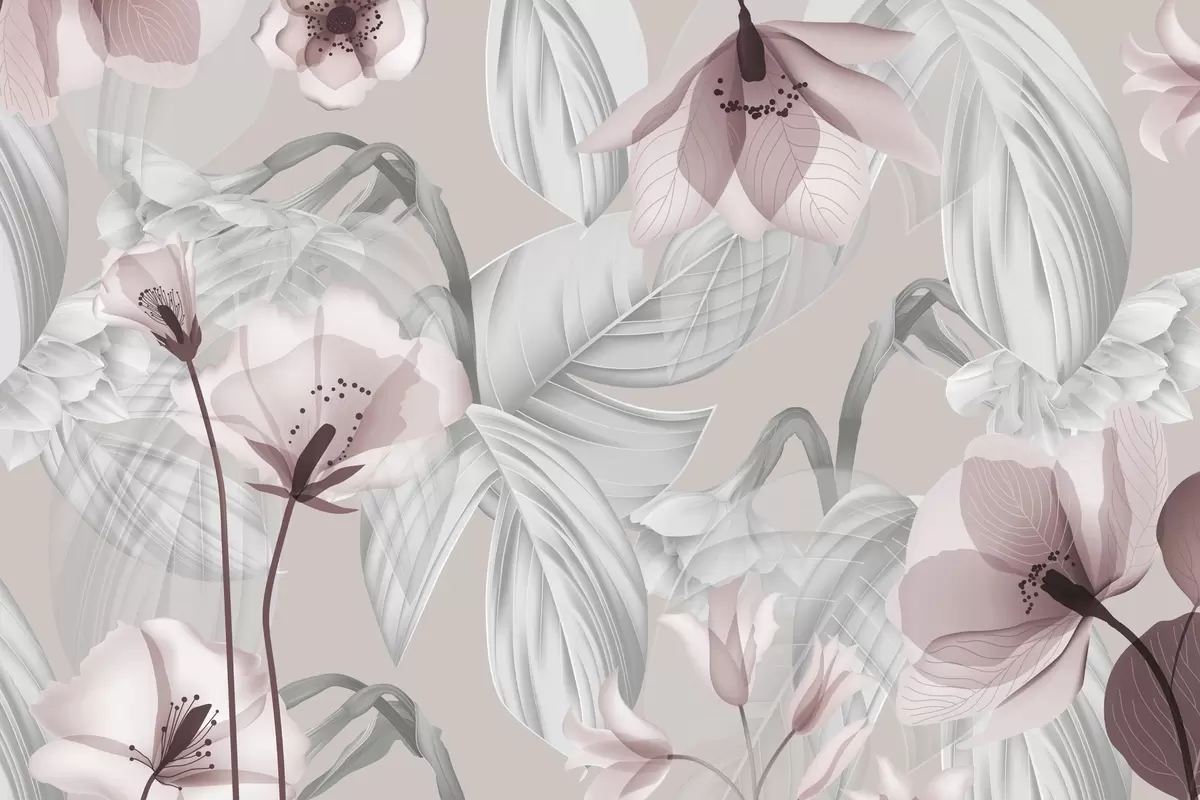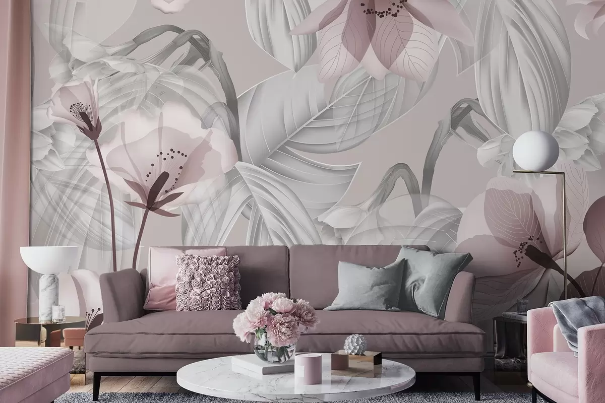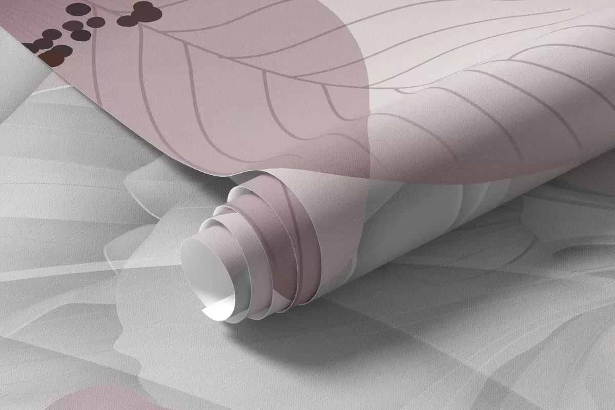 Stenske poslikave Rožnate cvetove in sive liste, cvetlični botanični ozadje, eleganten dizajn, nežne barve, svetli nežni detajli Št. w09497