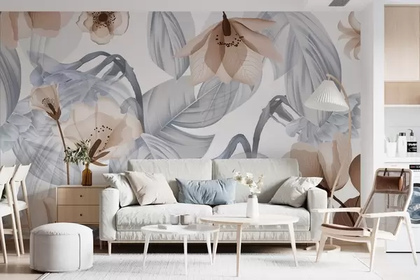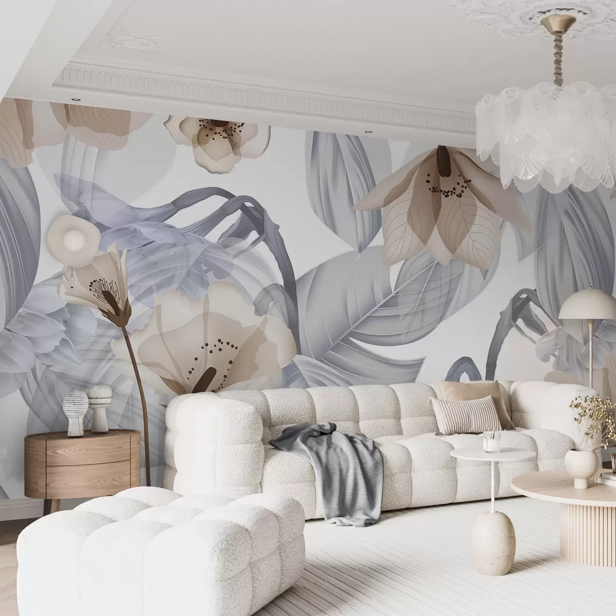 Stenske poslikave Rjave cvetove in sive liste, cvetlični botanični ozadje, eleganten dizajn, nežne barve, svetli nežni detajli Št. w09497v1