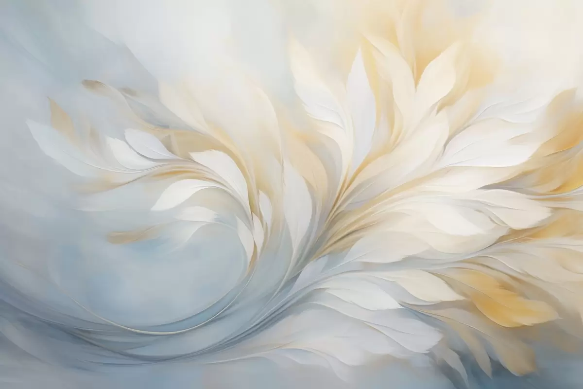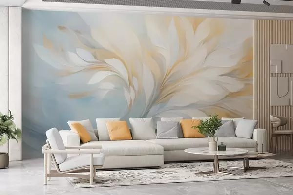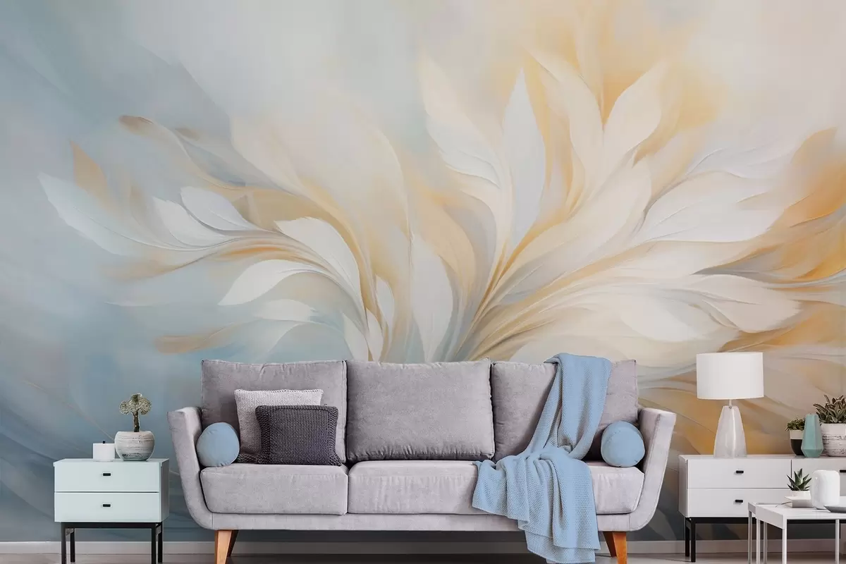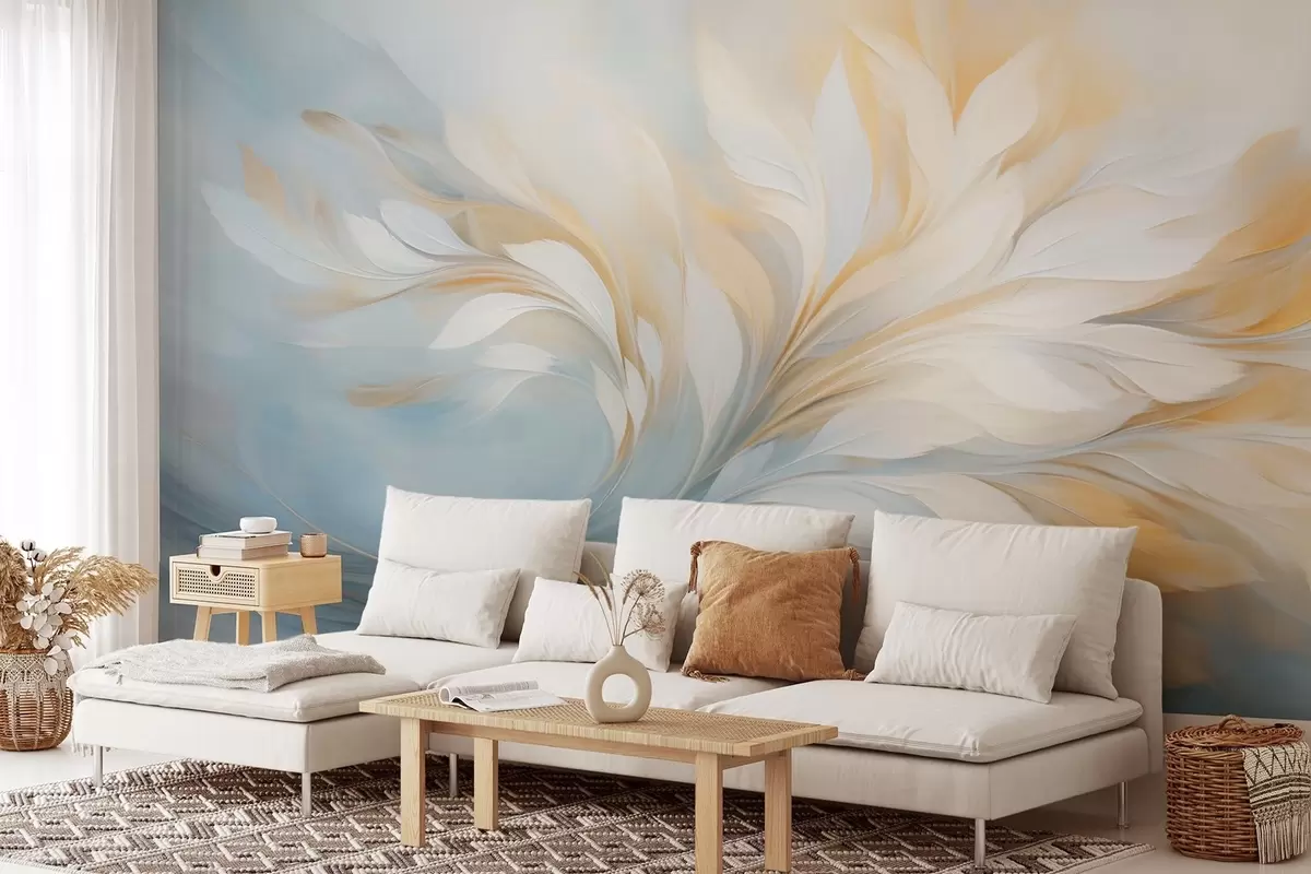 Stenske poslikave Abstraktna kompozicija gladkih peresastih oblik v rumenih in modrih odtenkih Št. w09525