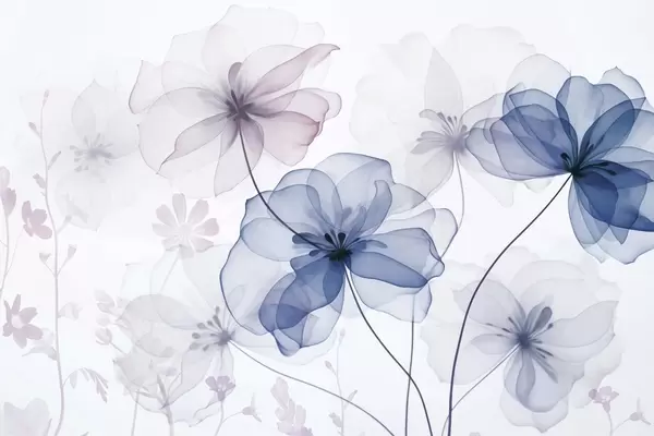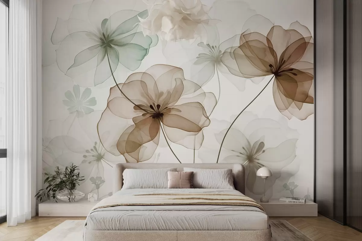 Stenske poslikave Prosojne cvetlice z rjavimi in zelenimi cvetnimi listi, dolgimi stebli, svetlim ozadjem, nežnimi barvami in teksturiranim cvetličnim vzorcem. Št. w09529
