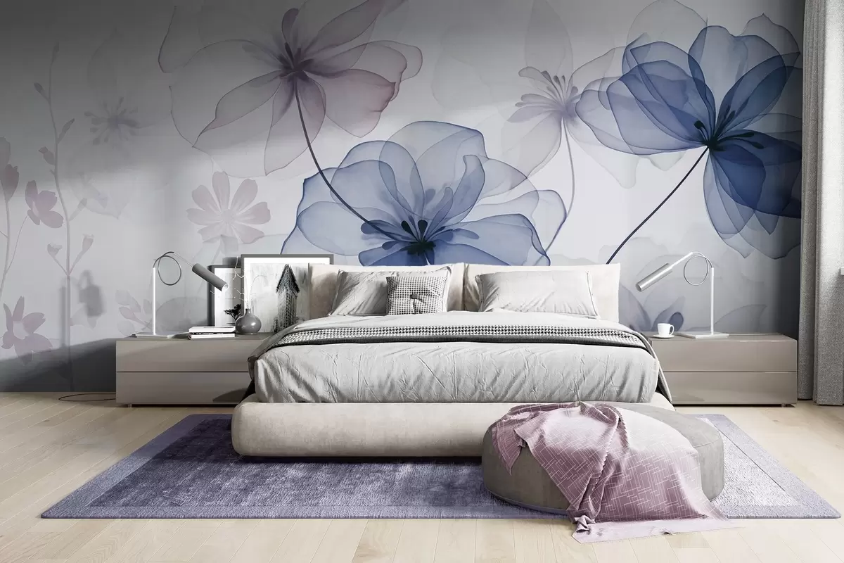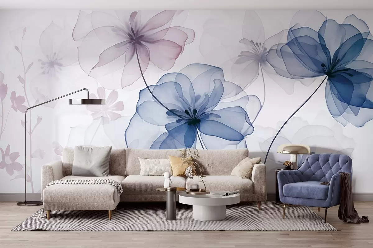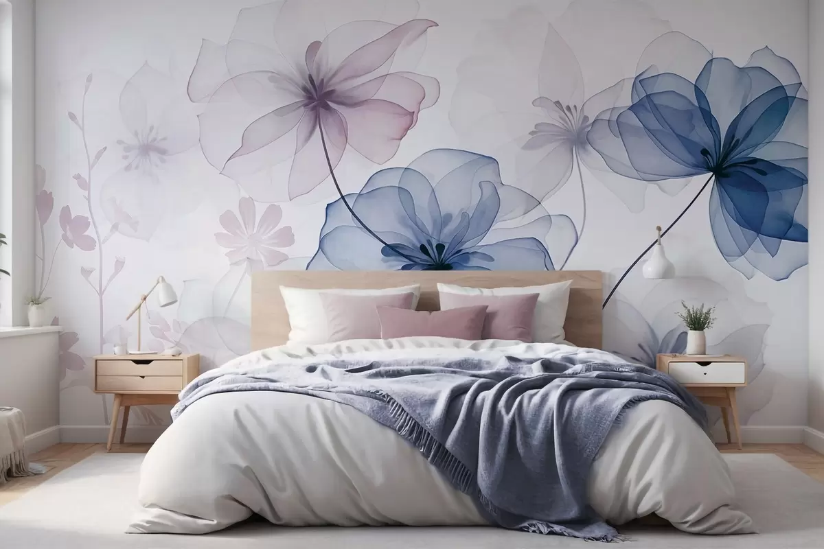 Stenske poslikave Prosojne cvetlice z nežnimi modrimi in rožnatimi cvetnimi listi, dolgimi stebli, svetlim ozadjem, nežnimi barvami in teksturiranim cvetličnim vzorcem. Št. w09529v1