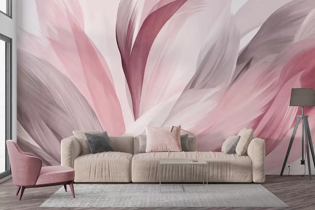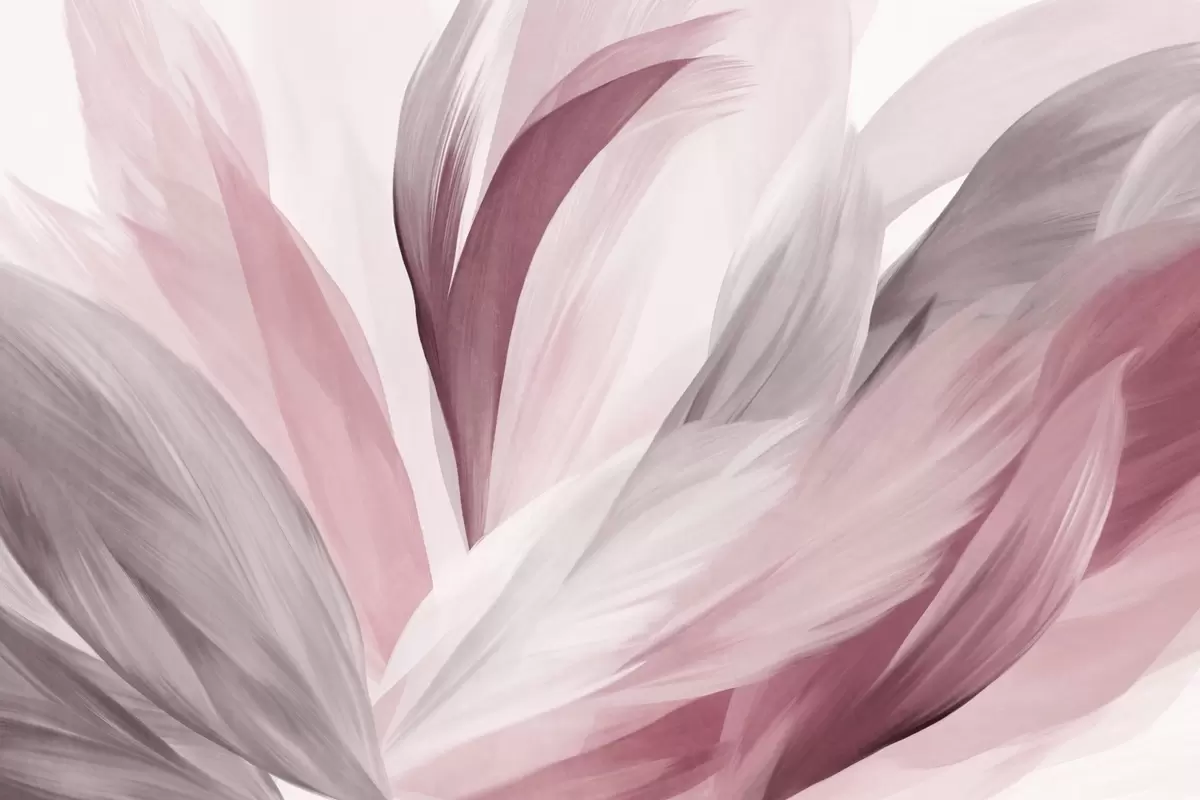 Stenske poslikave Abstraktne teksturirane perje v rožnati, beli in sivi barvi ter različnih odtenkih, ki se prekrivajo na belem ozadju. Št. w09531v2