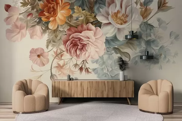 Stenske poslikave Vintage cvetlični aranžma z vrtnicami, potonikami in drugimi cvetovi z listjem na svetlem ozadju Št. w09532