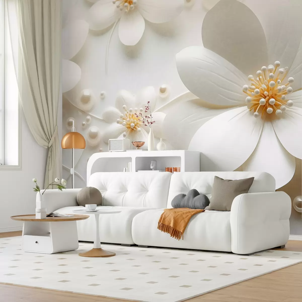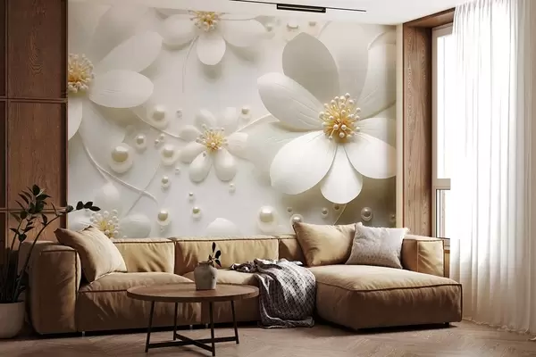 Stenske poslikave Bele cvetlice z biseri, razpršene na belem ozadju, eleganten in minimalističen dizajn, teksturirano Št. w09535