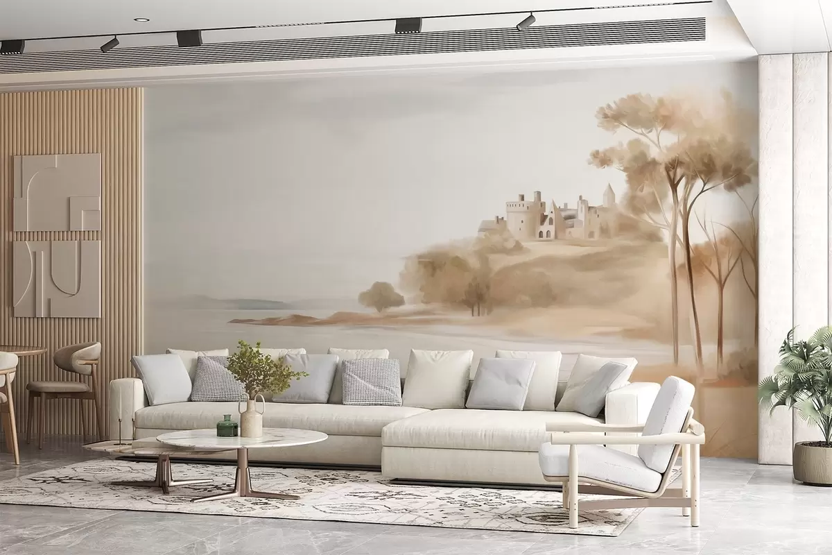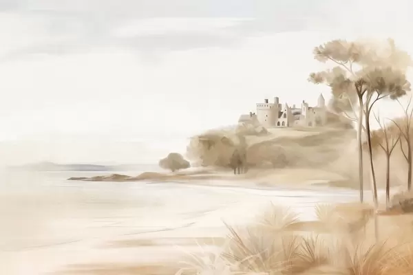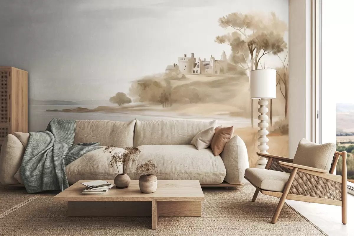 Stenske poslikave Pokrajina z gradom na hribu ob morju, peščena plaža v ospredju, pridušene barve, teksturirana umetnost Št. w09540