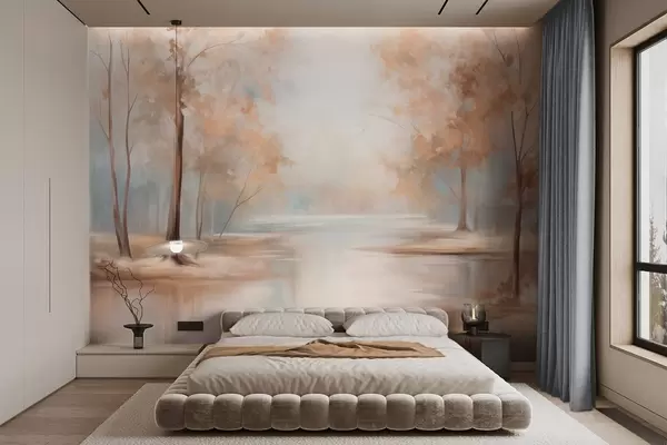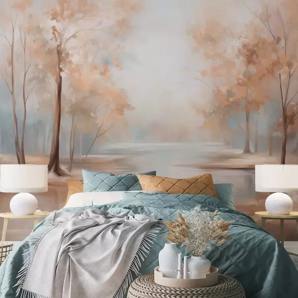 Stenske poslikave Jesenska teksturirana pokrajina z drevesi in reko, nežne barve, svetla in zračna atmosfera, mirna in spokojna scena Št. w09541