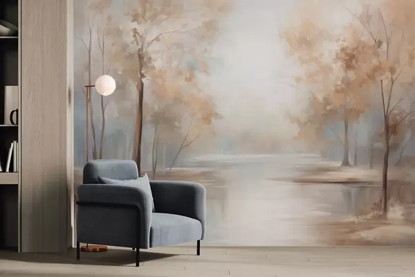 Stenske poslikave Jesenska teksturirana pokrajina z drevesi in reko, nežne barve, svetla in zračna atmosfera, mirna in spokojna scena Št. w09541