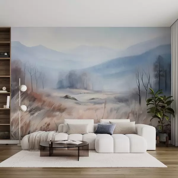 Stenske poslikave Teksturirana pokrajina s suho travo v ospredju in drevesi v ozadju, z gorami v daljavi Št. w09542