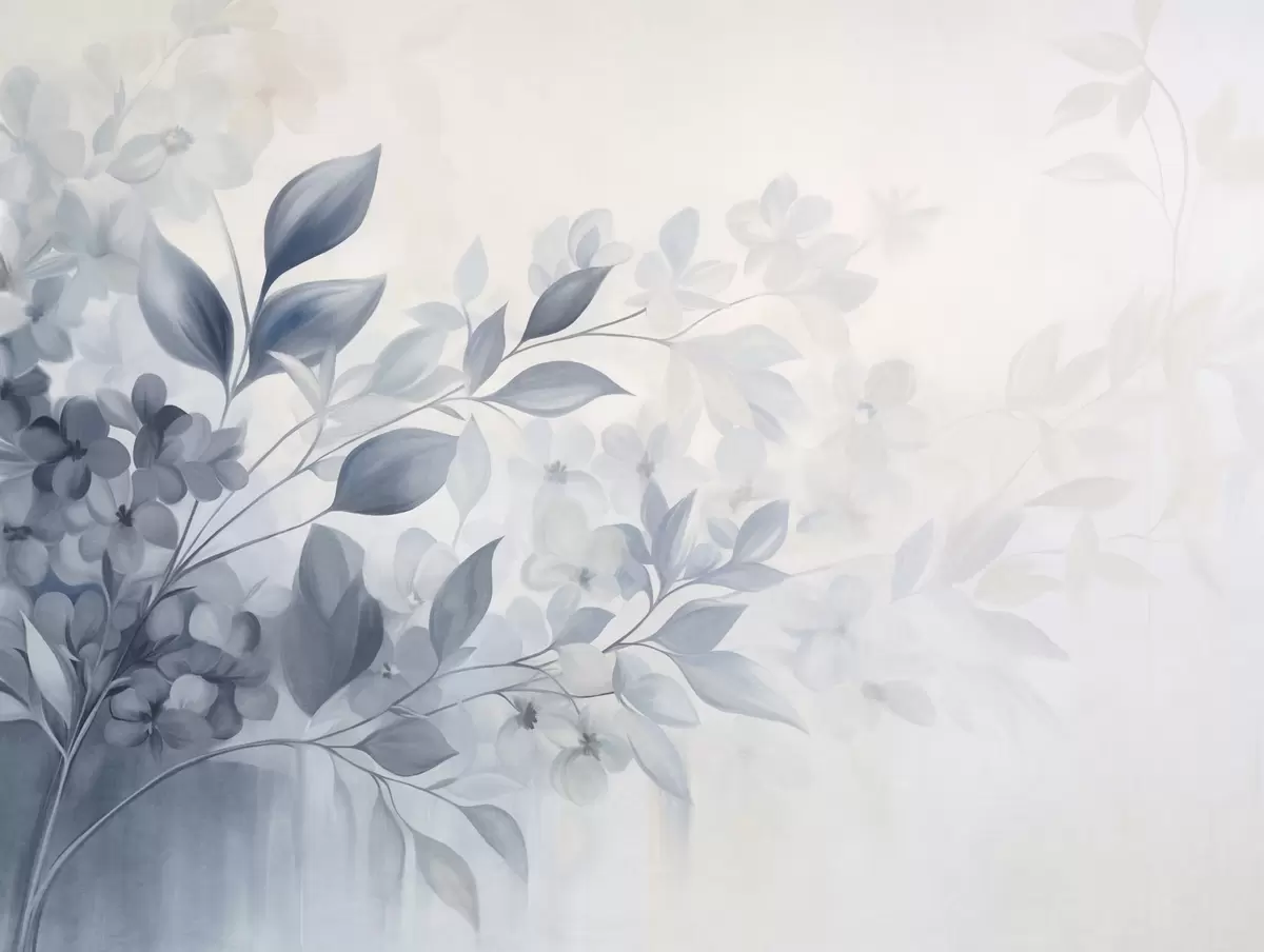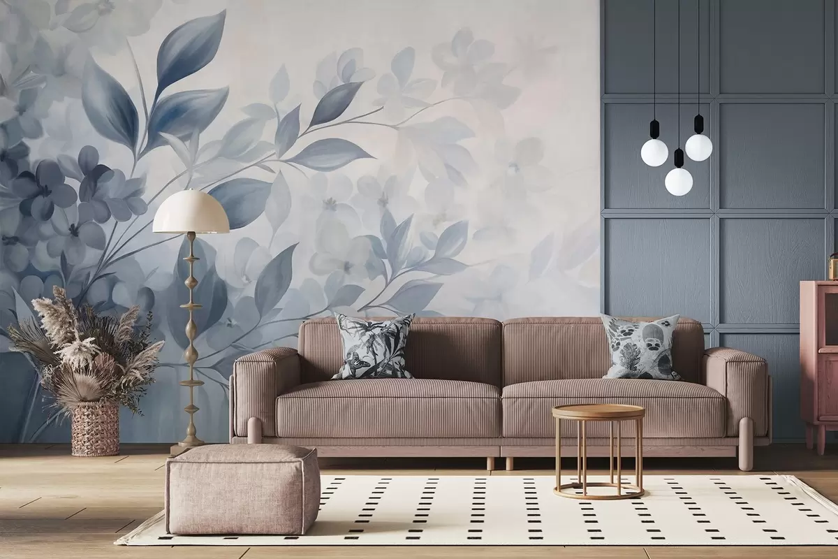 Stenske poslikave Teksturirana modra in bela veja s cvetovi in listi, ki se izgubljajo v svetlem ozadju v slogu akvarelne slike. Št. w09543