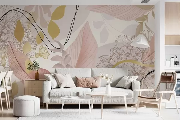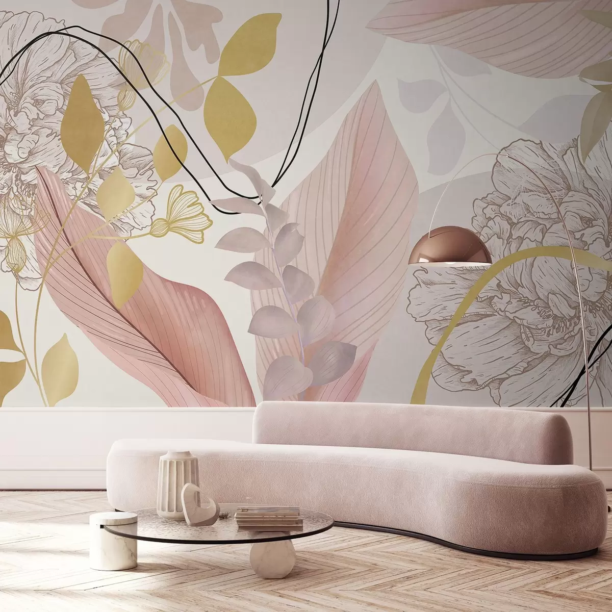 Stenske poslikave Abstraktni cvetlični potisk z velikimi listi v odtenkih pridušene roza, rumene barve s tankimi črnimi črtami in belimi cvetličnimi obrisom Št. w09544v1