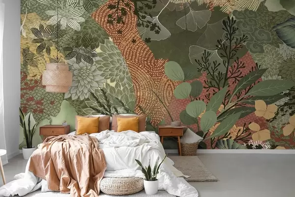 Stenske poslikave Abstraktna teksturirana kolaža botaničnih elementov z listi, cvetovi in organskimi teksturami v odtenkih zelene in rjave barve Št. w09545